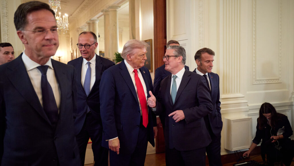 Donald Trump flankerad av Friedrich Merz och Keir Starmer. Mark Rutte i förgrunden. Fotograf: president.gov.ua