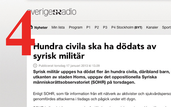 Den 17 januari 2013 publicerade många svenska medier en text från TT som sade att ”syrisk militär har dödat fler än 100 civila, däribland barn, i utkanten av staden Homs”. Som källa angavs ”oppositionella Syriska människorättsobservatoriet”.
