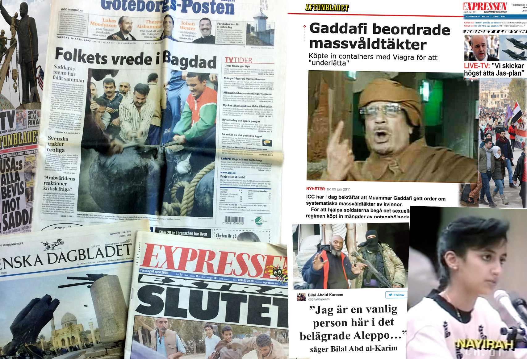 Bilderna från Bagdad den 9 april 2003 spreds snabbt över hela världen. De fanns på alla stora svenska tidningars förstasidor den 10 april.