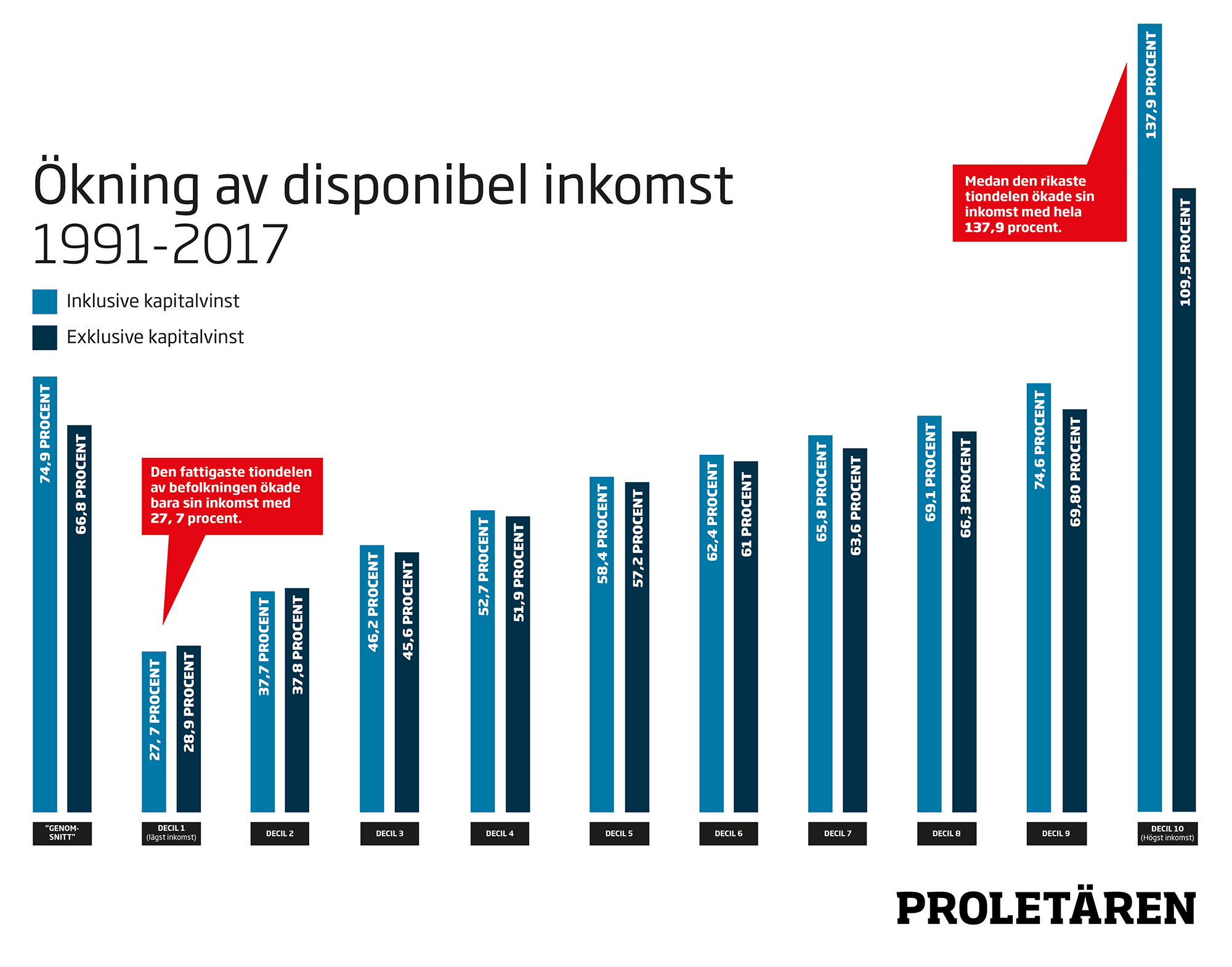 Skillnaderna i utvecklingen blir större när man räknar in kapitalvinster – vinster på aktier, bostäder, räntor med mera. Nu har den disponibla inkomsten ökat med 74,9 procent i genomsnitt, men samtidigt har den rikaste tiondelen ökat sin inkomst med hela 137,9 procent.