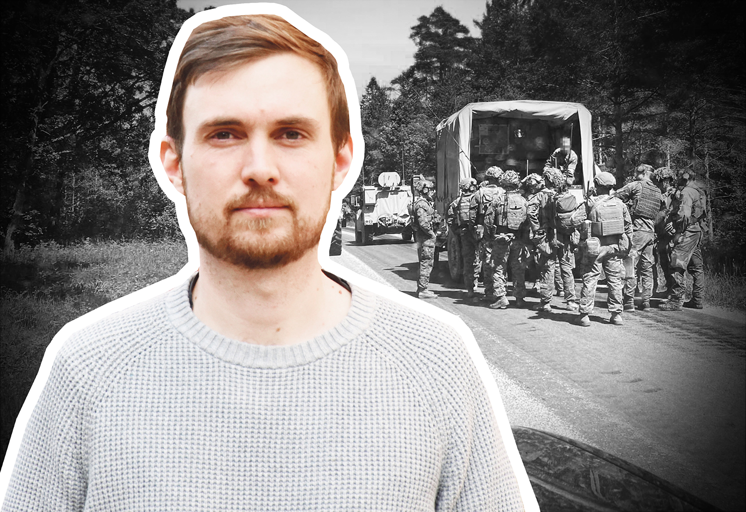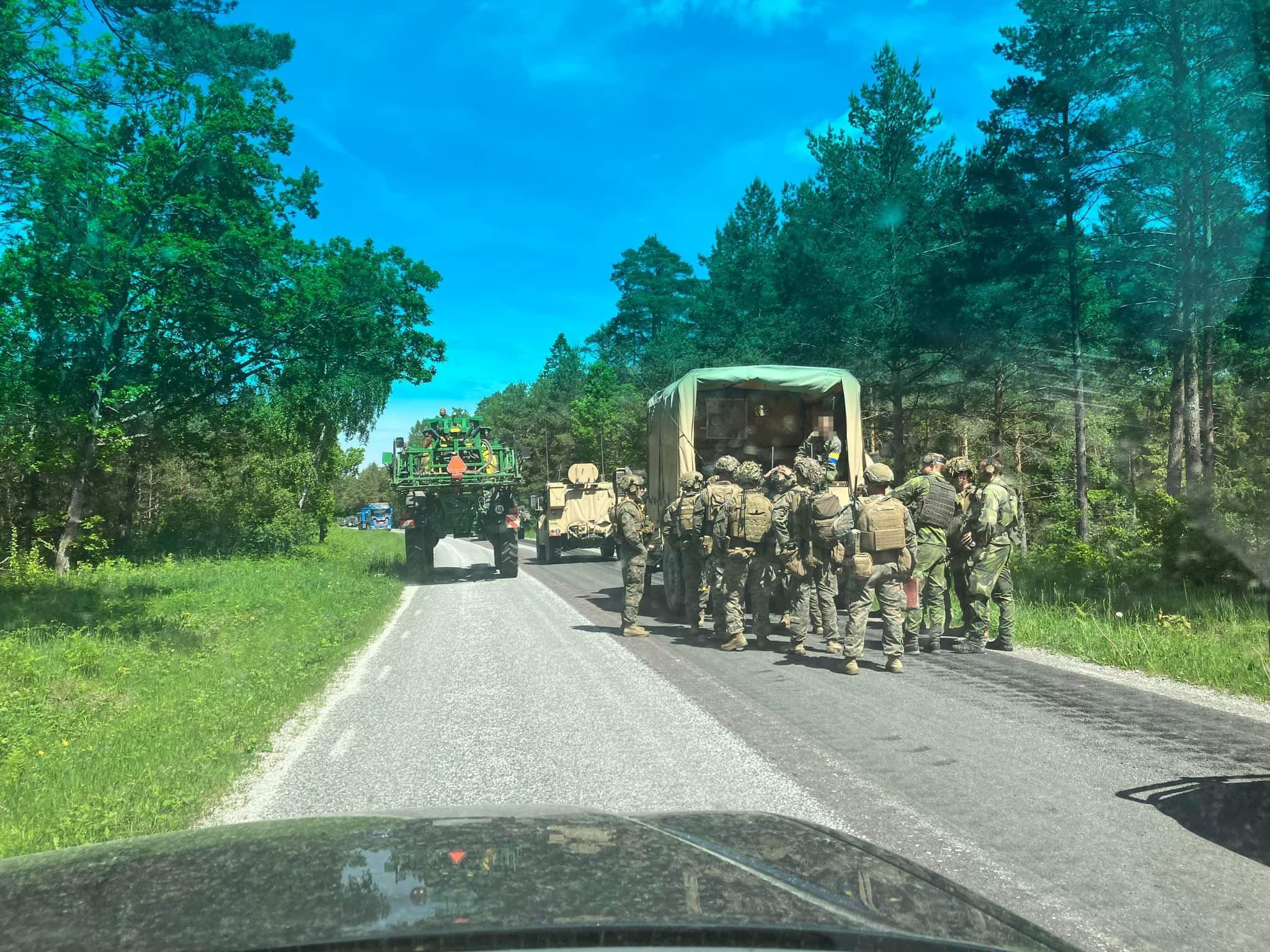 På en enslig landsväg i Ekeby socken, bara ett par kilometer från mitt gotländska barndomshem, har vi fastnat bakom en stillastående militärkolonn.