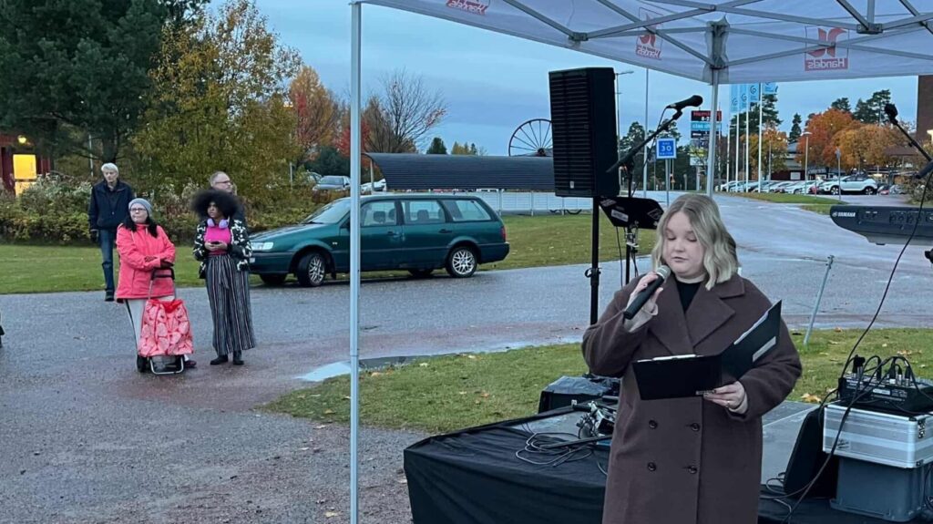 Johanna Östberg talade på en manifestation mot Clas Ohlsons lönesänkningar förra veckan. Fotograf: Privat