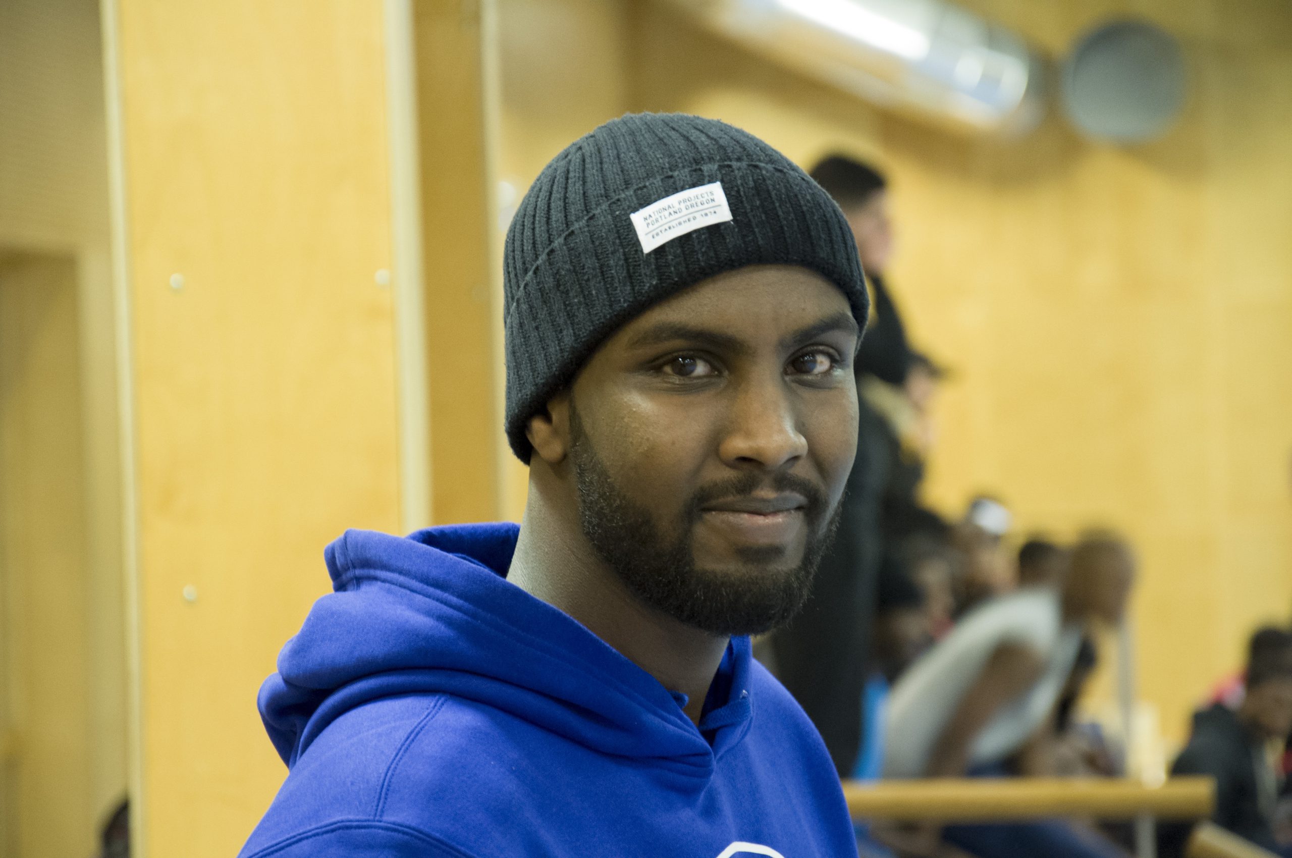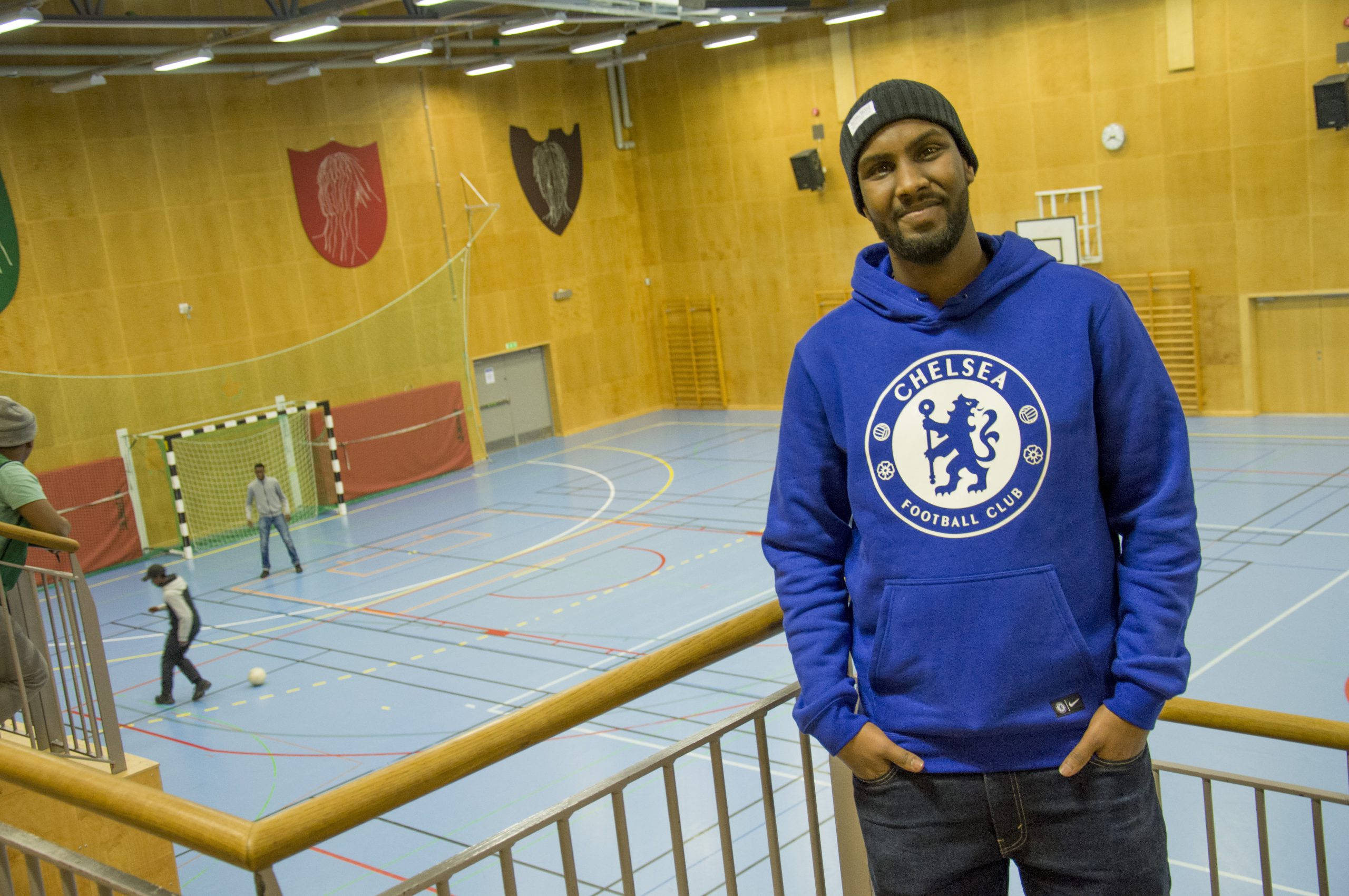 Vi har en halvtimme på oss, meddelar Harun Abdulahi. Sedan börjar nästa aktivitet som han måste hjälpa till med. Vi slår oss ned i ett av idrottshallens kontor.