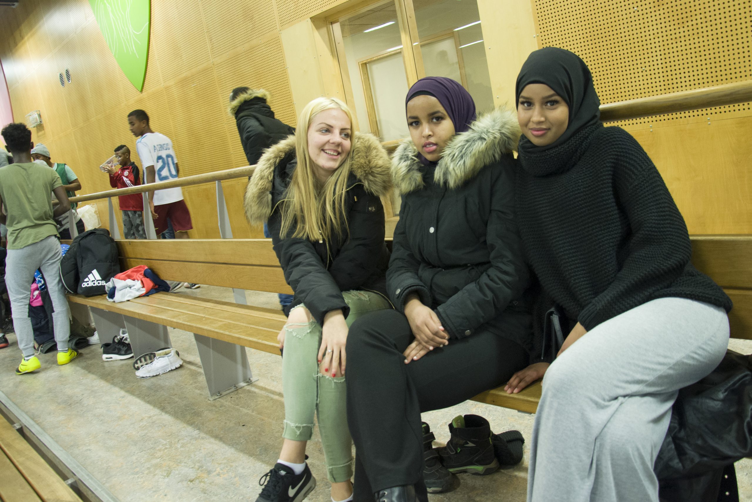 Överallt är det aktivitet. I stora hallen pågår en fotbollsmatch. I en mindre lokal övar några tjejer dans. Harun Abdulahi visar oss runt, presenterar oss för killar och tjejer som är här med kompisar för att se på eller delta i aktiviteterna. Det är fredagskväll och Bergsjön SK ansvarar för öppen träning i Sandeklevshallen vilket betyder att vem som helst kan komma hit.