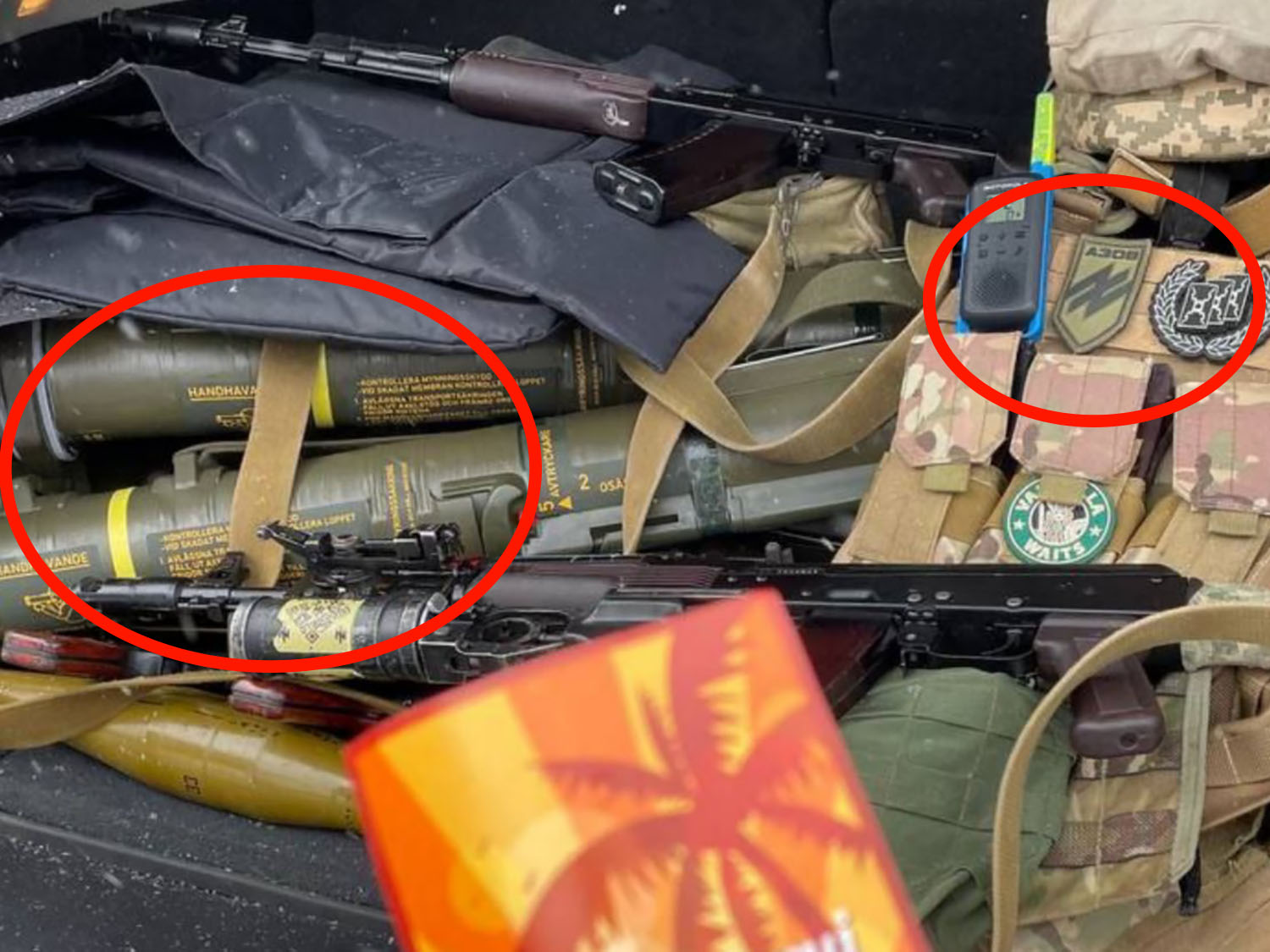 Svenska pansarskott 86/AT4 tillsammans med militärutrustning med emblem för Azovbataljonen och gruppen Centuria, som är en del av Azovbataljonen. Foto: Twitter / skärmdump