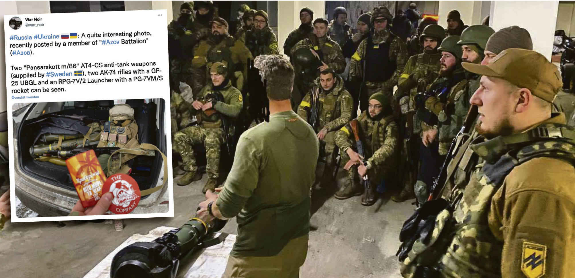 Redan i tisdags förra veckan rapporterade den belarusiska (provästliga) kanalen Nexta att Natovapen, däribland Saab-tillverkade Robot 57, levererats till Azovbataljonen, vilket bland annat Dagens ETC uppmärksammade. Robot 57-systemet är tillverkat av Saab, men inte levererat av Sverige, utan av Storbritannien. Men även svensklevererade vapen tycks ha hamnat i nazisters händer, eller bakluckor.