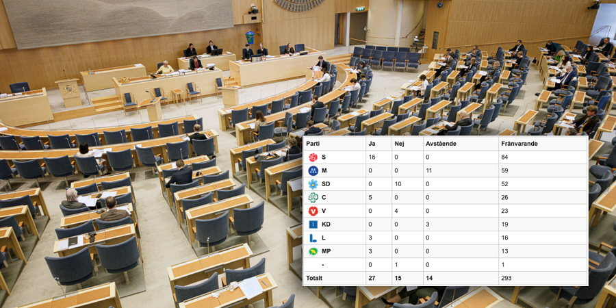 Bara 56 ledamöter deltog i voteringen. Totalt blev röstsiffrorna 27 för, 15 emot och 14 avstående – om M och KD valt att rösta nej hade förslaget alltså fallit.
