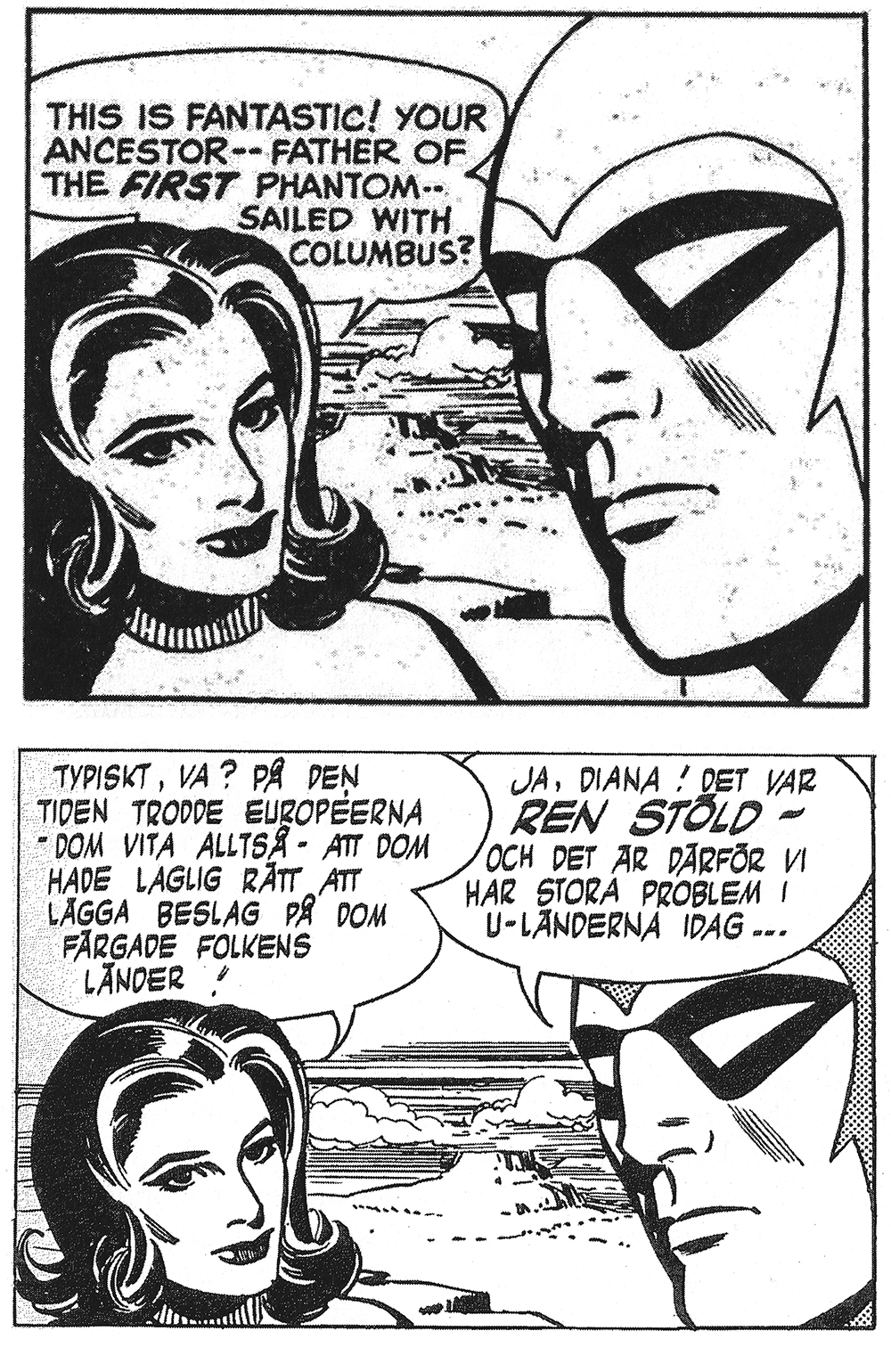 Exemplen är flera på hur den svenska redaktionen förvandlat amerikanskproducerande Fantomenserier till något som är mer gångbart i Sverige. När Diana får veta att den 21:a Fantomens förfader seglade med Columbus, säger hon enligt Lee Falk att ”Det är fantastiskt. Din förfader, den förste Fantomens pappa, seglade med Columbus?” Fantomen själv tiger.