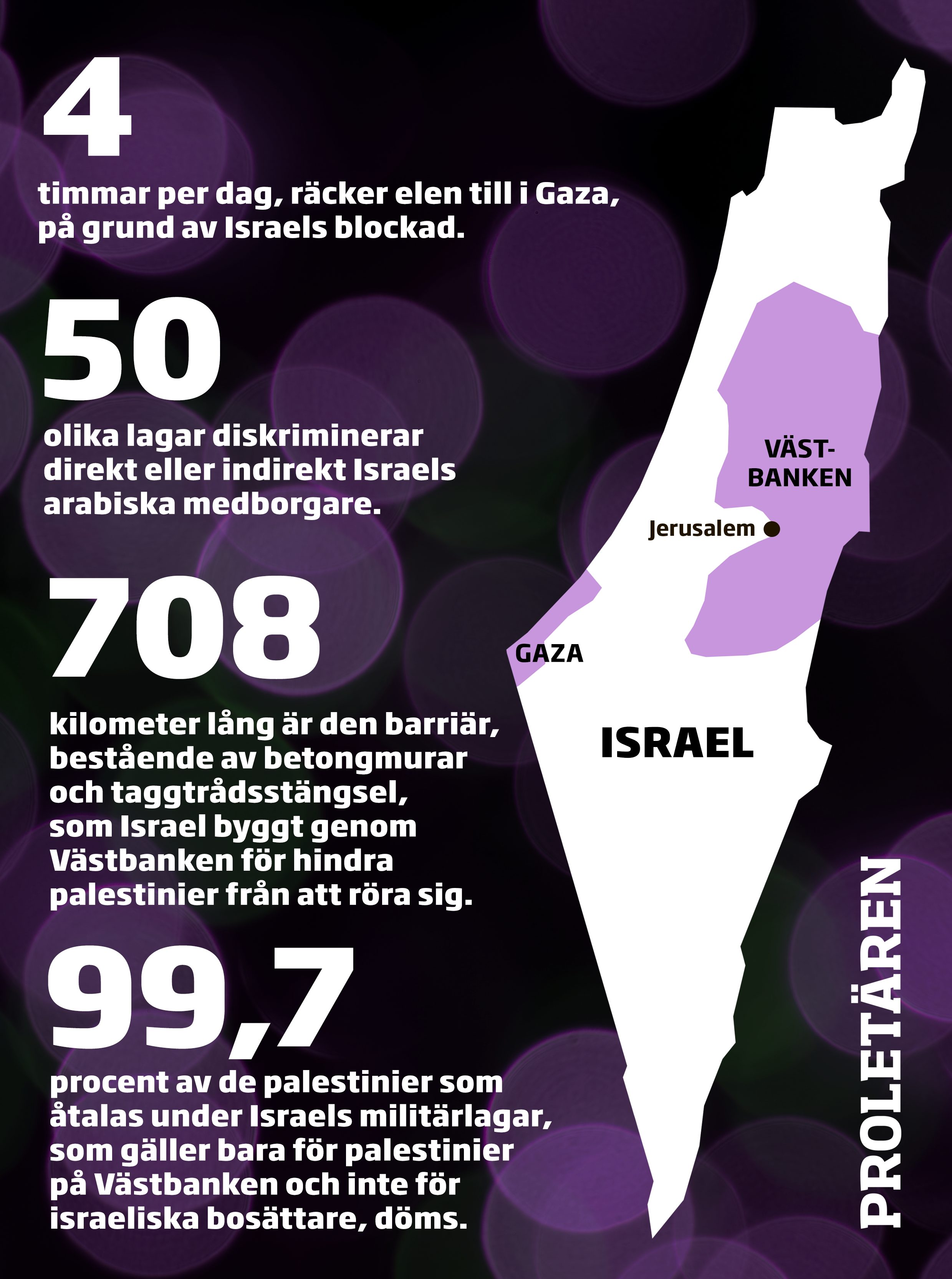 Ockupationen av Palestina präglas av våld och terror mot den palestinska befolkningen. Med jämna mellanrum anfaller Israel Gaza. I bombkampanjen 2014 (Operation Protective Edge) dödades 2251 palestinier, varav majoriteten civila, enligt UNHRC.