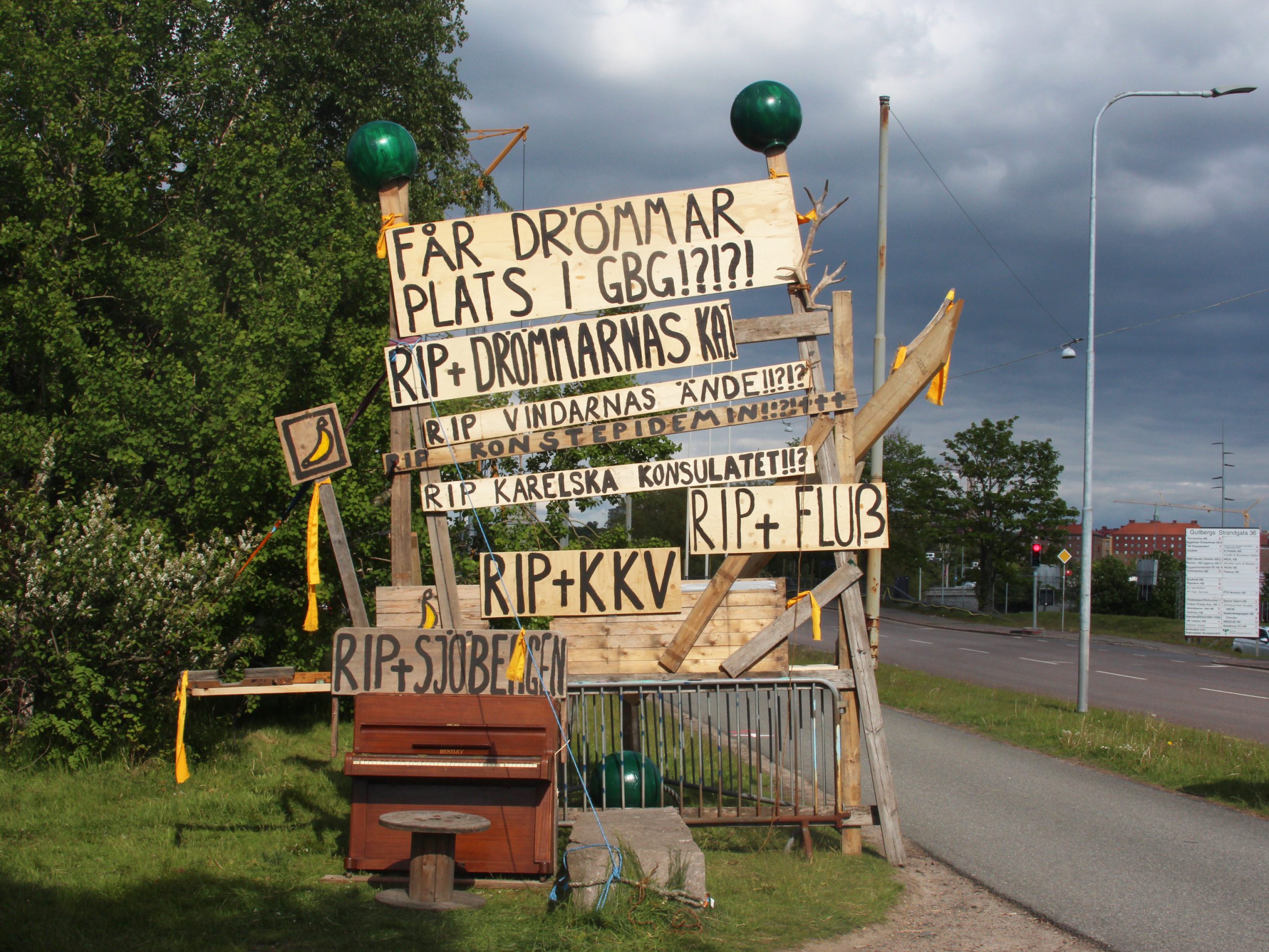 ”Får drömmar plats i Göteborg?” – den frågan ställer sig Göteborgskonstnären Sebastian Rudolph Jensen, som tillsammans med kollegan Hannes Ödman Kaminsky på bara en dag smällde upp en stor skulptur vid Drömmarnas Kaj. Den påminner betraktaren om nedlagda eller hotade kulturverksamheter, som bland annat Drömmarnas Kaj och Konstepidemin, men också tidigare mötesplatser, som populära musikscenen och kulturföreningen Truckstop Alaska, och Cafe Fluss vid Frihamnspiren.