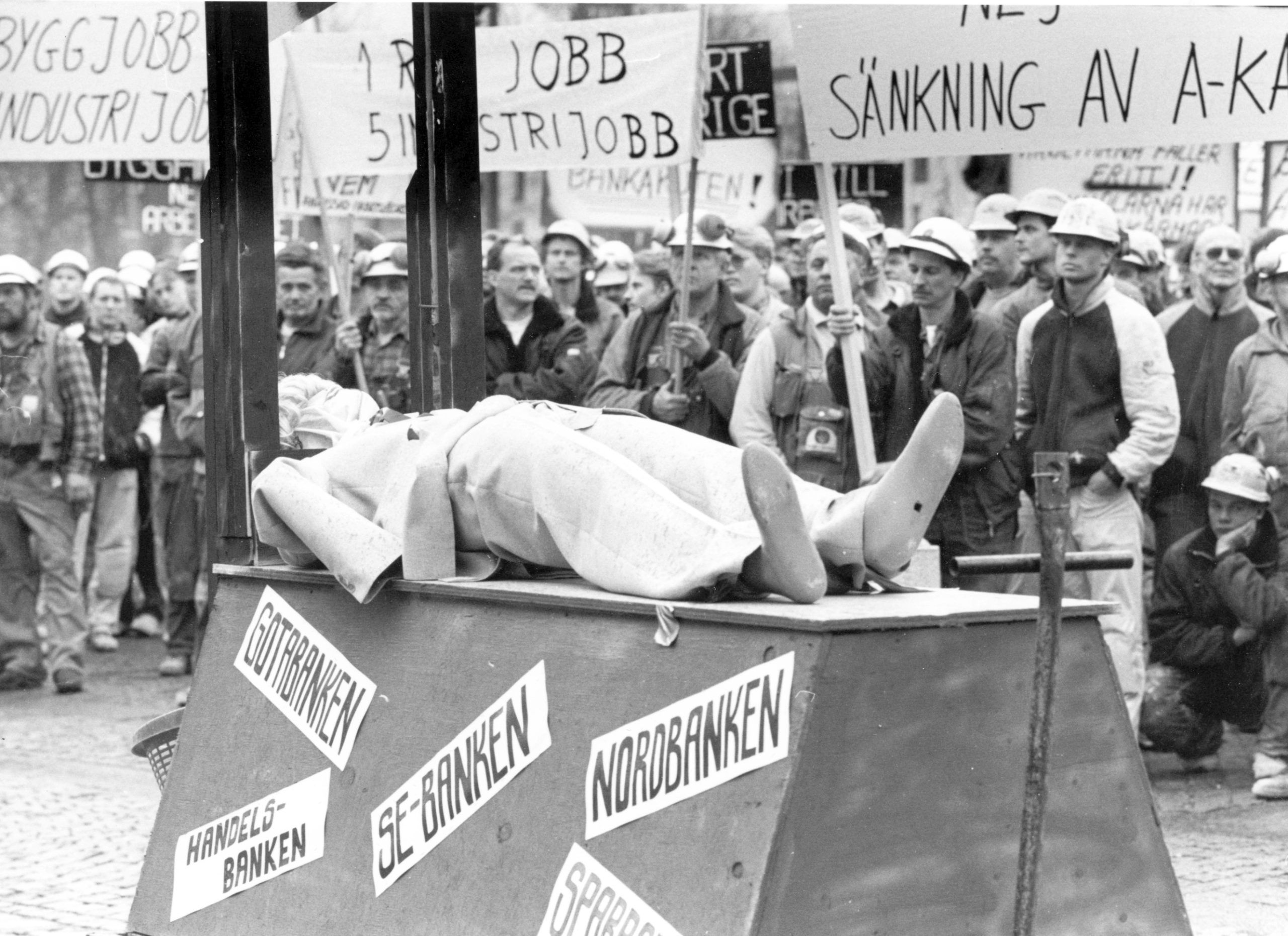 I täten för demonstrationen drog vi en kärra med en hopsnickrad modell av en giljotin. Denna hade vi döpt till Arbetarnas bankakut. Det berättade vad vi tyckte om att arbetarklassen och folket fick betala krisen.