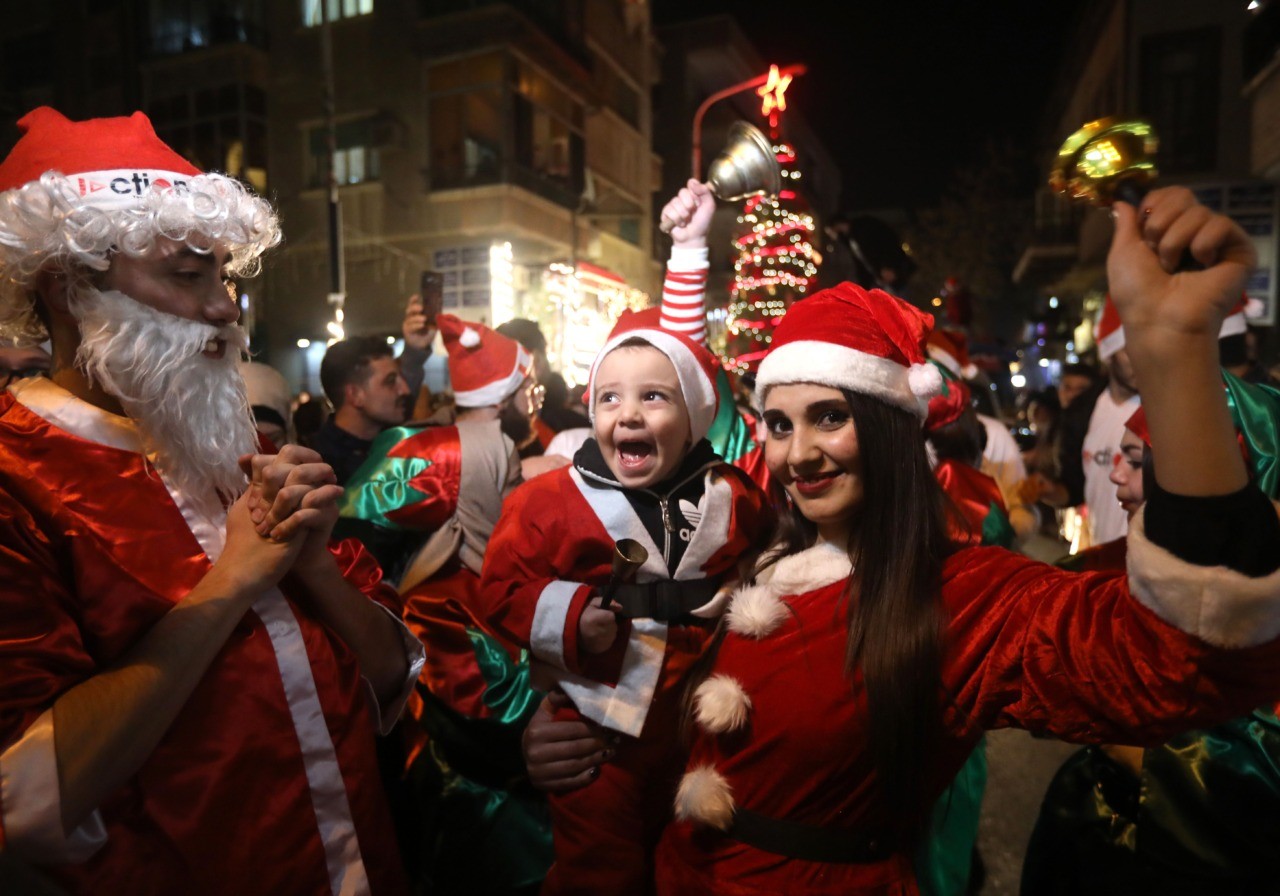Bilder från julaftonskvällen i Damaskus visade tomteparader och folk på gatorna.