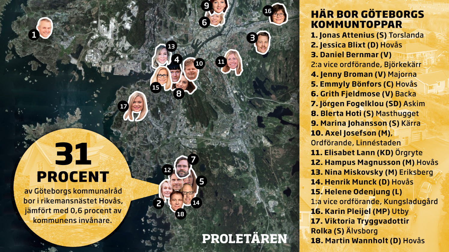 Ingen av Göteborgs 18 välavlönade kommunalråd bor i något av områdena Angered, Bergsjön, Biskopsgården, Hammarkullen eller Tynnered/Västra Frölunda. Däremot bor fem stycken, alltså mer än var fjärde, i rikemansnästet Hovås. Detta visar en granskning som GT gjort.