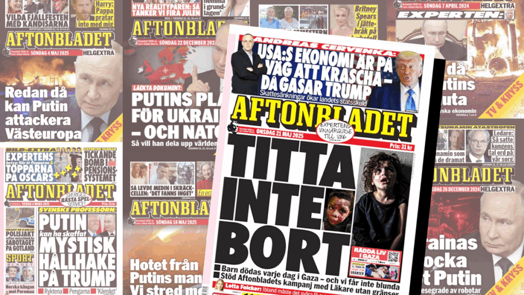 Aftonbladet påbörjar en Gaza-insamling och försöker rentvå sitt samvete efter ett och ett halvt år av tystnad kring folkmordet. Under ett och ett halvt år omnämner tidningens förstasida inte ”Gaza”, ”Palestina” eller ”folkmord” en enda gång i huvudrubrikerna. ”Putin” nämns samtidigt 182 gånger.