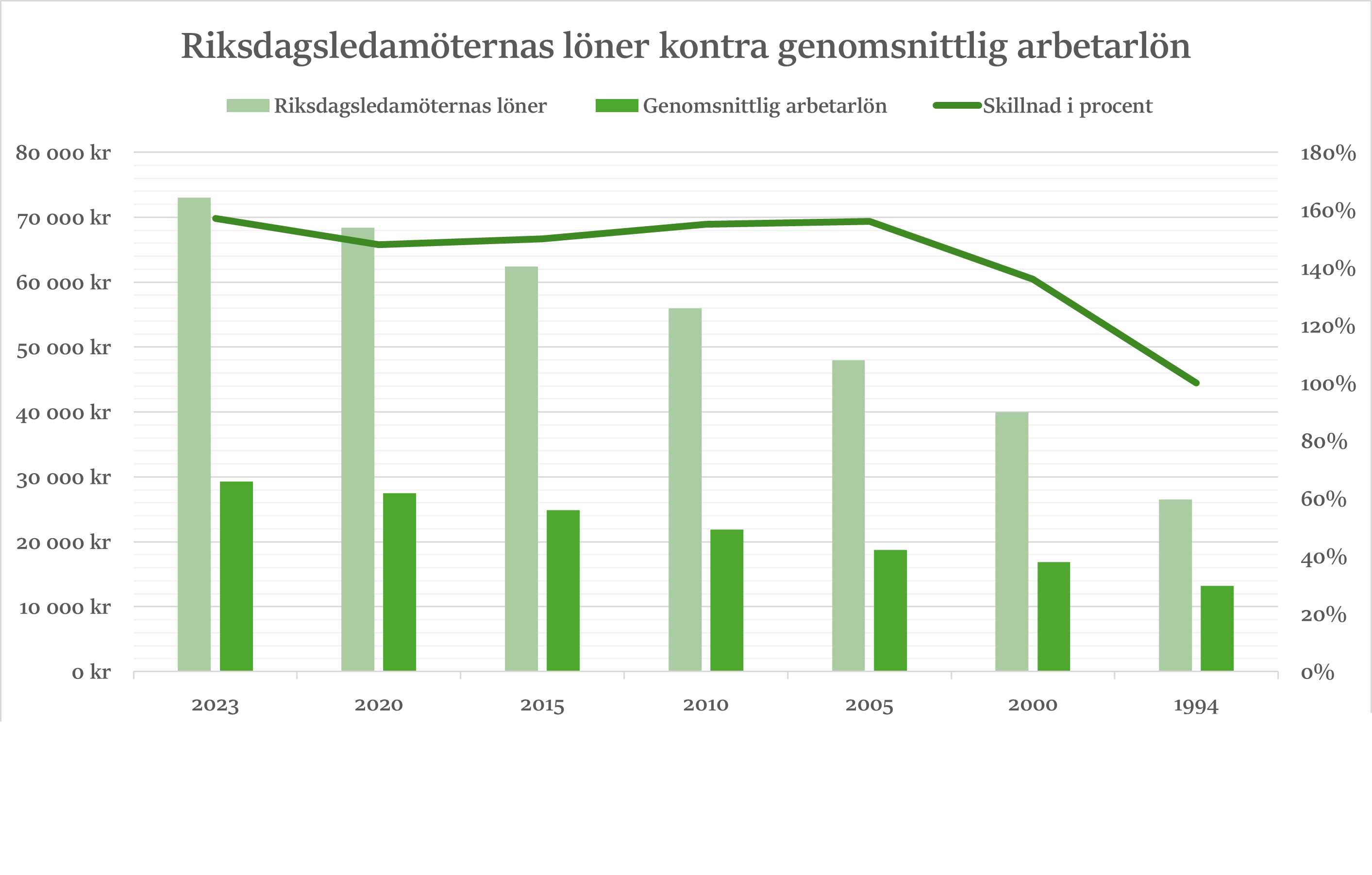 Mellan 1994 och 2019 har till exempel riksdagens ledamöter ökat sin lön med 158 procent, enligt riksdagens arvodesnämnd. Kommunalanställda har under samma period ökat sina löner med endast 121 procent, enligt statistik från SCB.