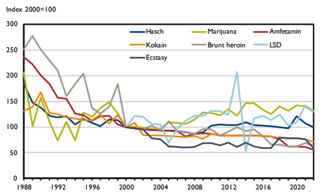 Enligt Centralförbundet för alkohol- och narkotikaupplysning har priset på flera tunga droger, som kokain, amfetamin och brunt heroin blivit billigare sedan millennieskiftet. Lättare droger som marijuana och hasch har dock gått upp i pris (se diagram).