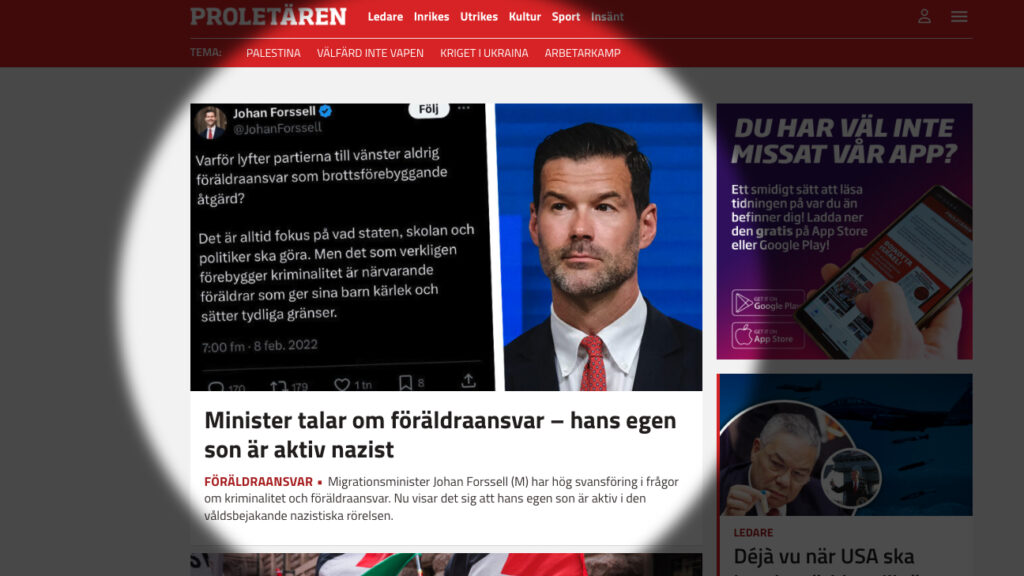 Migrationsminister Johan Forssells son visade sig vara aktiv nazist. Det var Expo som stod för det ursprungliga avslöjandet, men i det svenska medielandskapet är det bara Proletären som talar klarspråk om vem det handlar om, efter att den autonoma organisationen Afa avslöjat namnet och bland andra forskaren Tobias Hübinette skrivit om det på sociala medier.