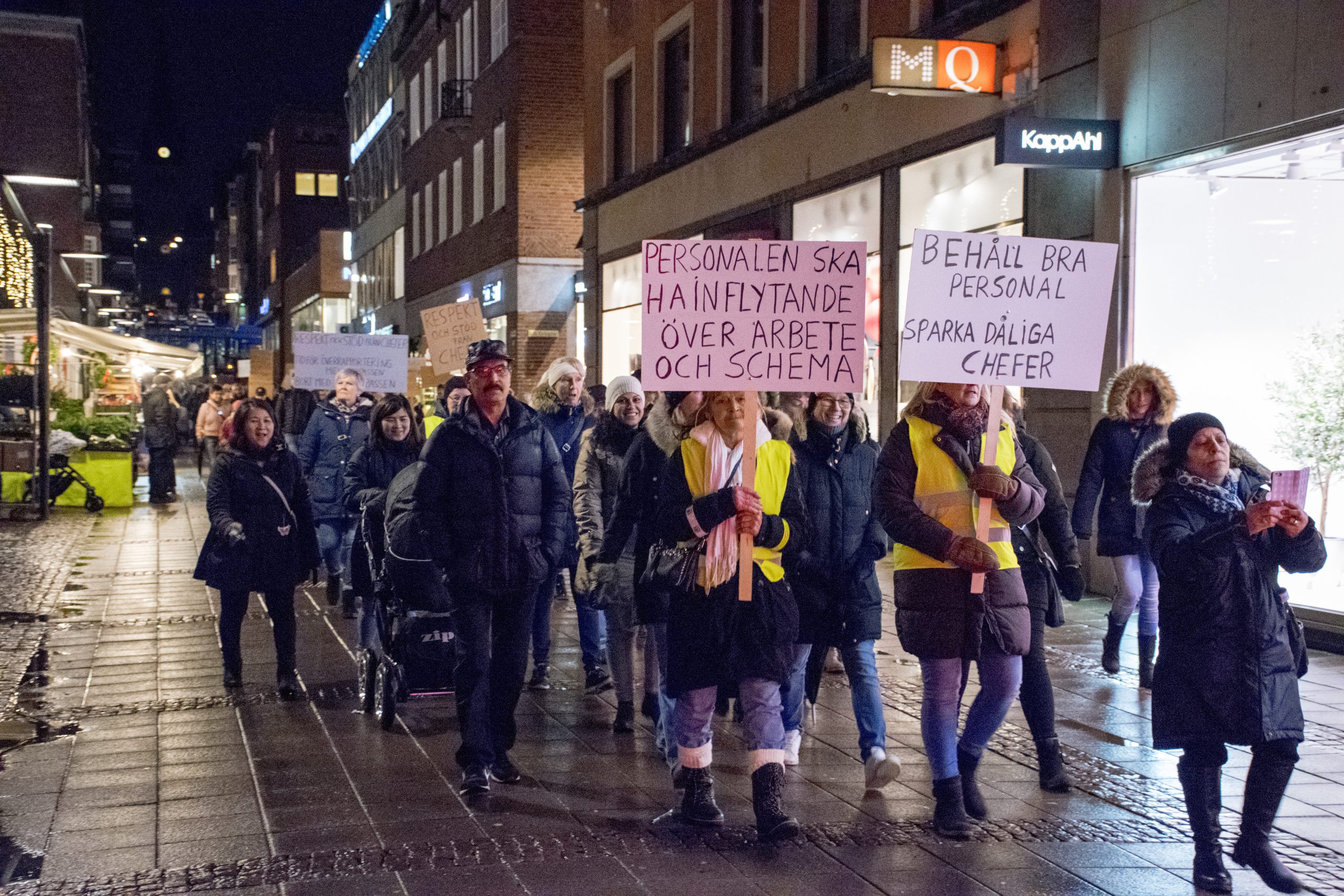 – Vår chef tog undan listorna samma dag som vi lade fram dem, berättar en undersköterska. Det är jättemånga som vill skriva på som inte har gjort det. Demonstrationståget går genom centrala Borås och på sina ställen bildas det långa bilköer. En del tutar för att visa sitt stöd.
