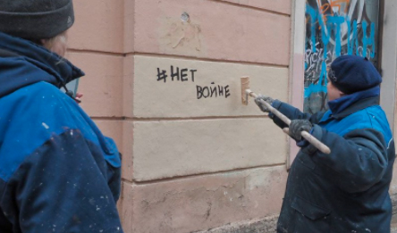 ”Nej till kriget”-klotter målas över i St. Petersburg dagen efter protesterna. Foto: Telegram/@fontankaspb