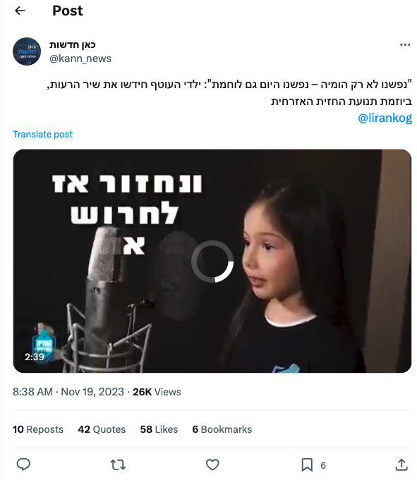 En musikvideo där israeliska barn sjunger en sång som hyllar Israels terrorbombningar och att det ”inom ett år inte kommer att finnas någon kvar” i Gaza har väckt stor uppmärksamhet på sociala medier. Många förfasas över låttexten – men många israeler hyllar musikvideon och sången som de menar ”ger gåshud”.