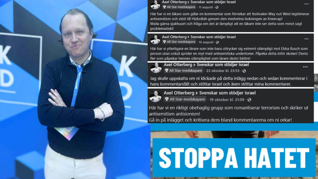 I Facebookgruppen ”Svenskar som stödjer Israel” hängs Israels kritiker ut med namn, bild och arbetsgivare. Bakom flera av uthängningarna står KD-politikern Axel Otterberg – som kandiderar till riksdag, region och kommun för Kristdemokraterna. Trots intern kritik fortsätter han att hetsa gruppens medlemmar att kontakta offrens arbetsgivare i hopp om att få dem sparkade.