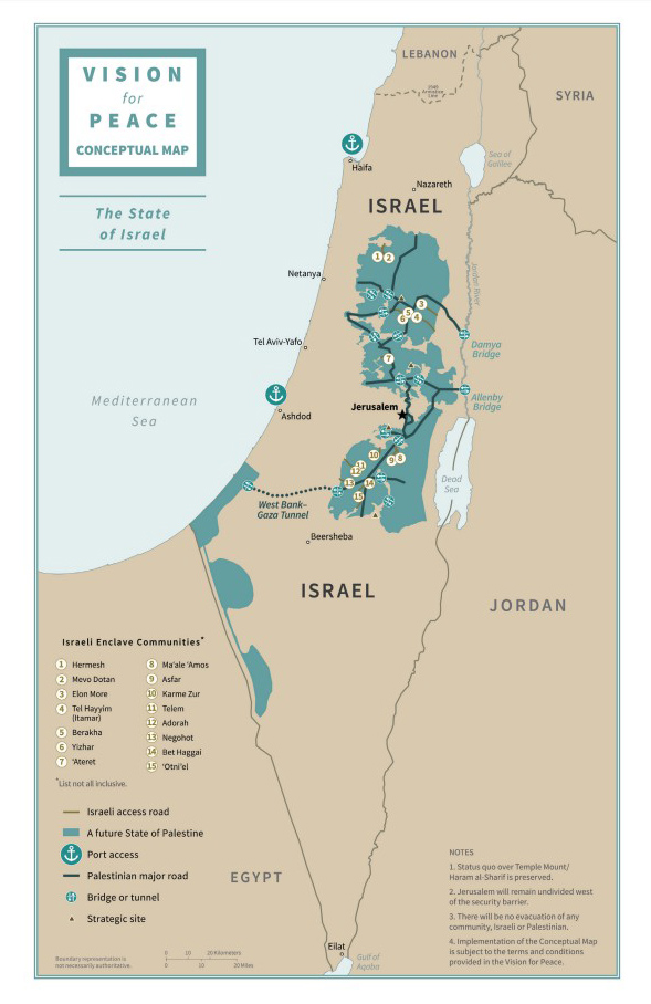 • Jordandalen, som utgör gränsområdet mellan Västbanken och Jordanien, införlivas i Israel.
