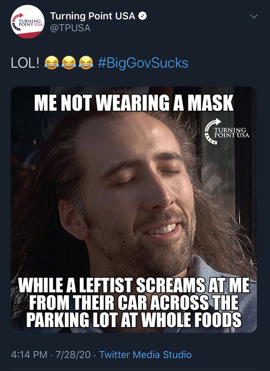 Charles Kirk, organisationens ansikte utåt, är också en högljudd motståndare till munskydd, som han menar gör mer skada än nytta. Samma dag som Montgomery dog twittrade organisationen en meme som hånar ”vänsterfolk” som har på sig munskydd och följer restriktionerna. Inlägget togs senare bort.