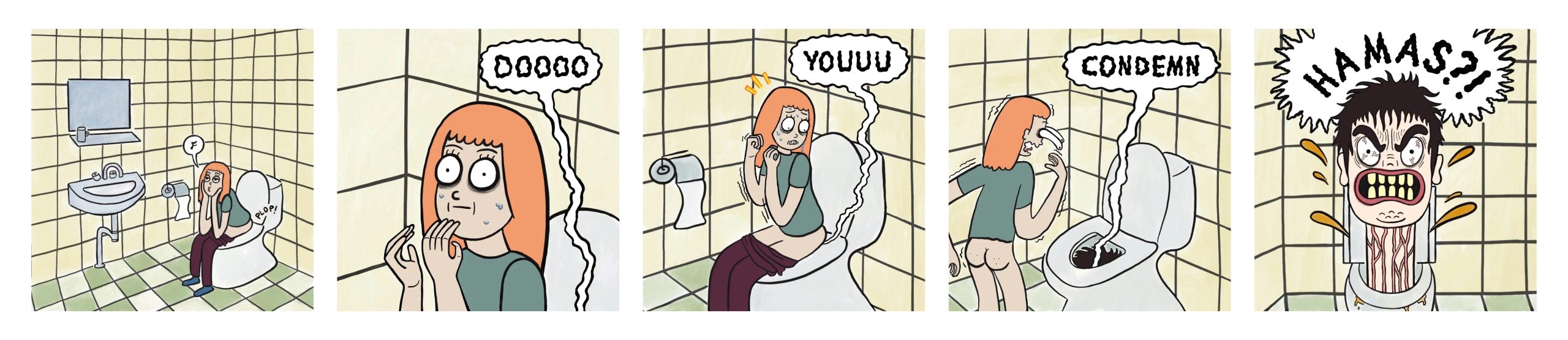 De västerländska etablissemangets malande krav på alla Palestinavänner att fördöma Hamas återkommer i flera av hennes serier (i en stripp dyker en arg liberal upp ur toalettstolen och kräver av en oskyldig bajsande tjej att hon fördömer Hamas)
