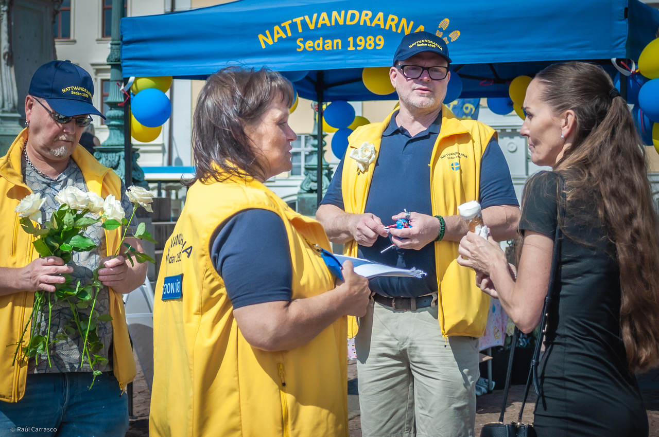 På torget träffar vi nattvandrarna Marita Karlsson och Yvonne Sana, som delar ut blommor till förbipasserande. De berättar att bemötandet är bra, och att många vill prata om våldet och skjutningarna.