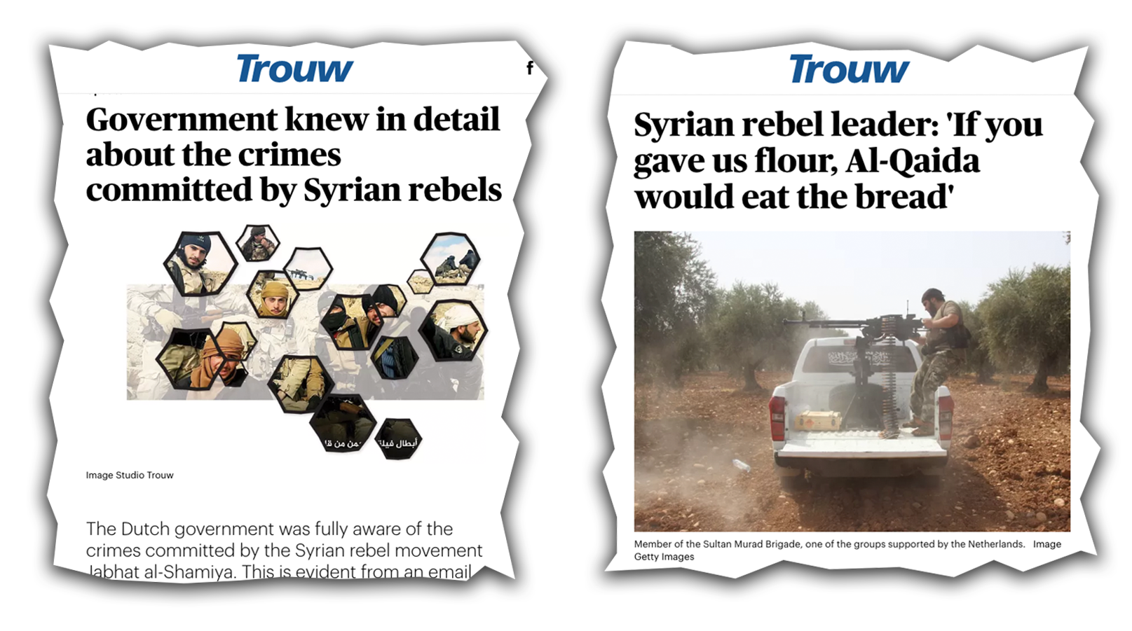 Nieuwsuurs och Trouws granskning visar att ovanstående inte efterlevdes. Utöver 27 miljoner euro till Fria syriska polisen och Vita hjälmarna framkom att Nederländerna gett materiellt stöd till 22 olika väpnade organisationer. Bland dem fanns grupper som gjort sig skyldiga till terroristbrott och etnisk rensning.