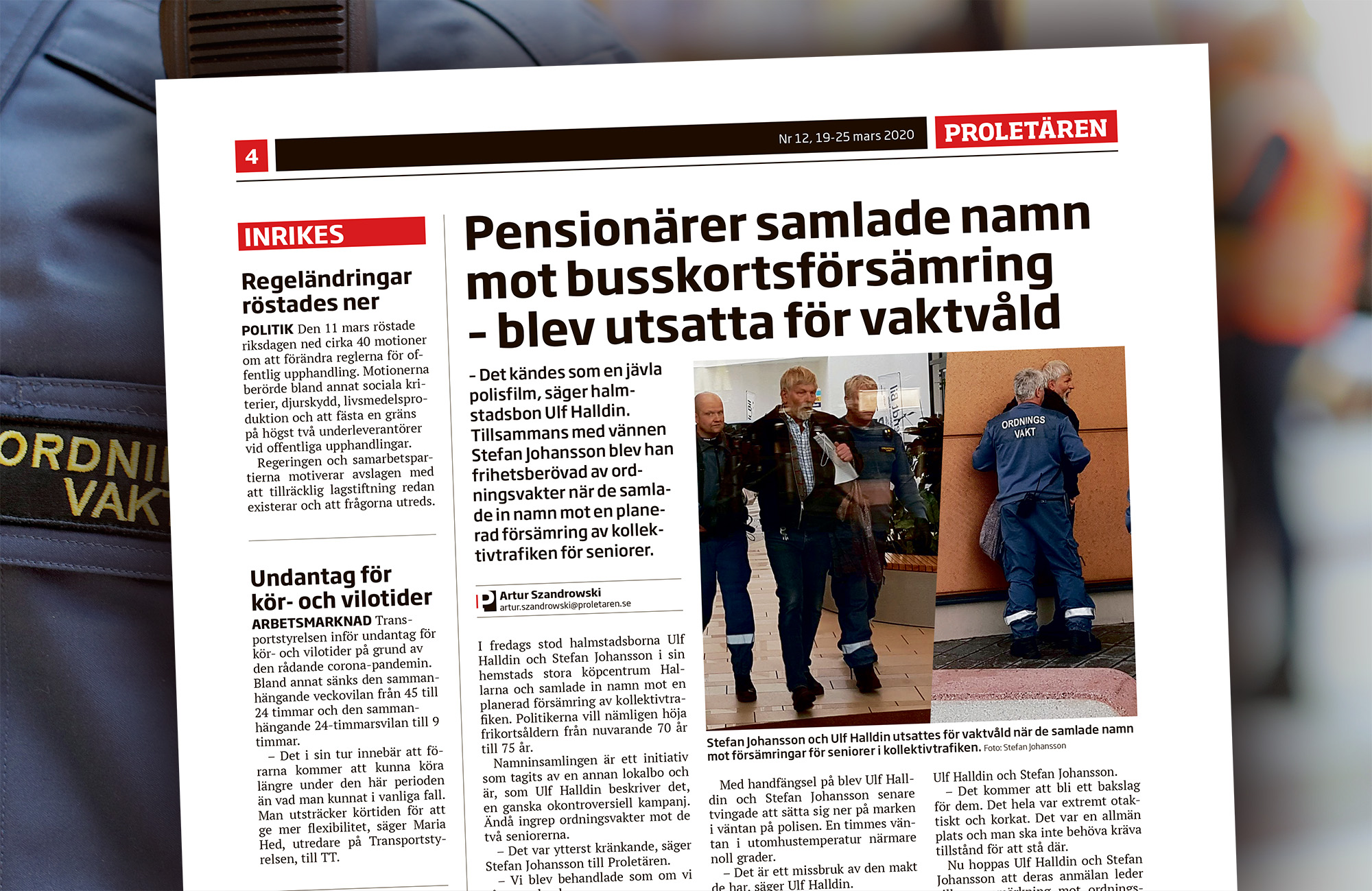 Det var i mars som Halmstadborna Ulf Halldin och Stefan Johansson blev illa behandlade när de samlade in namn mot en planerad försämring av kollektivtrafiken för stadens äldre – en höjning av frikortsåldern från 70 till 75 år. Ordningsvakter ingrep mot de bägge seniorerna och körde ut dem ur köpcentrat Hallarna – trots att detta räknas som offentlig plats.