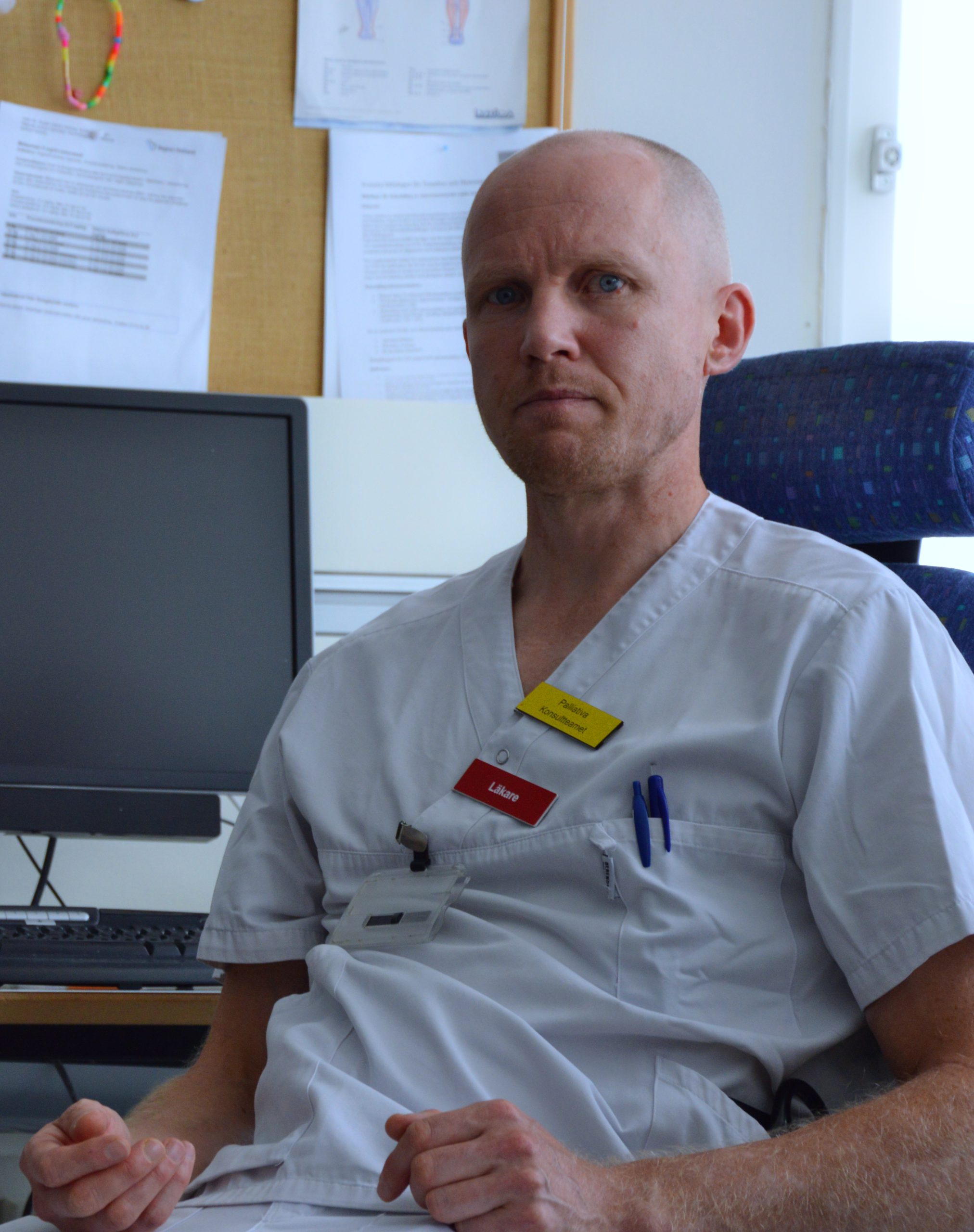 Oskar Knutsson är läkare på den palliativa enheten tre våningar upp. Sedan en tid tillbaka är han engagerad i protesterna som riktat sig mot ledningen och politikerna inom Region Jämtland/Härjedalen.