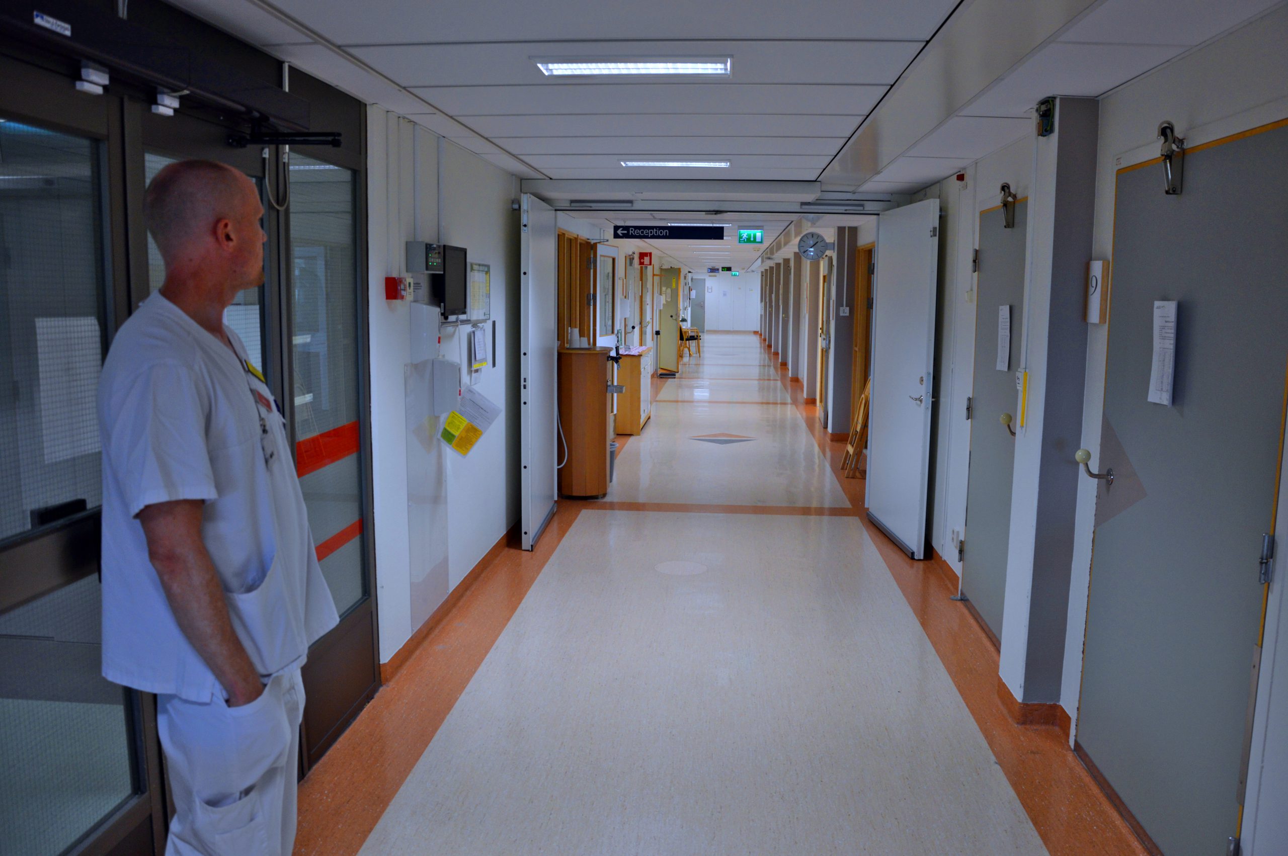 I slutet av korridoren sitter två vårdanställda i en soffa och dricker kaffe. Här kan de njuta av något som inte finns på många andra platser på sjukhuset: en stillhet där det enda som fyller korridorerna är ventilationens monotona sus.