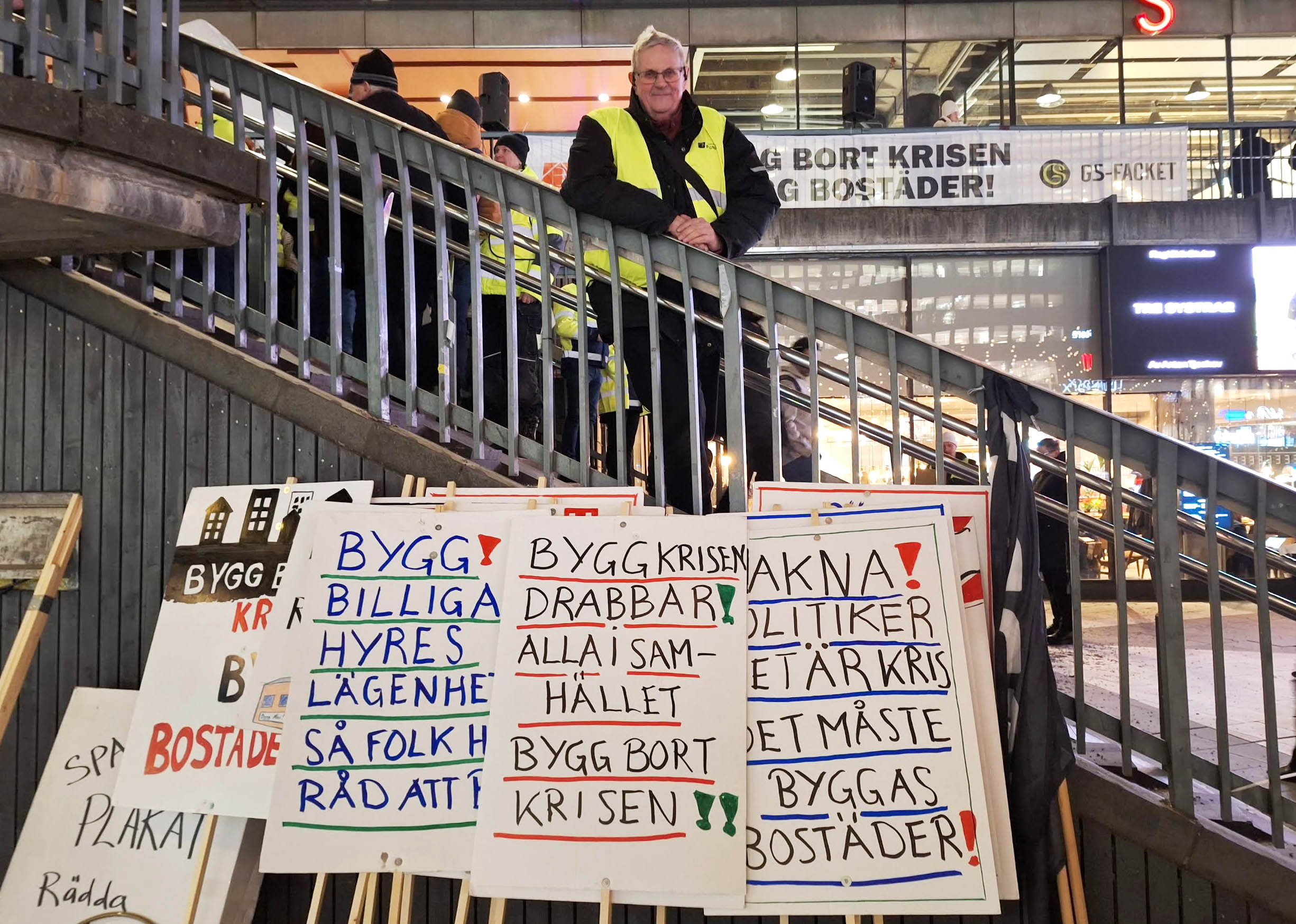 – Jag hade kanske velat ha lite fler representanter för lokala facken här [på Sergels Torg], men vi är nöjda med namninsamlingen. Det har spridits bra ut i landet. Nu fortsätter vi med offentliga möten i fackets regi: hur ska bostadspolitiken se ut, vad är det vi ska kräva? Vi ska bjuda in folk som är bra på bostadspolitik, på möten och kanske som studiecirklar, säger Stefan Slottensjö till Proletären. Vi ska titta på infrastrukturen och den offentliga upphandlingen, det är ju rena kaoset där… vilka jävla upphandlingar man gör. Jag såg en upphandling nyligen där Skanska var tvåa och det företag som vann var en miljard billigare. Och de uppfyllde bara två av nio uppställda kriterier… hur i helvete kan de få jobbet? Alla fattar ju hur det slutar, vilka byggjobbare som tas in och vilka löner de ska jobba för.