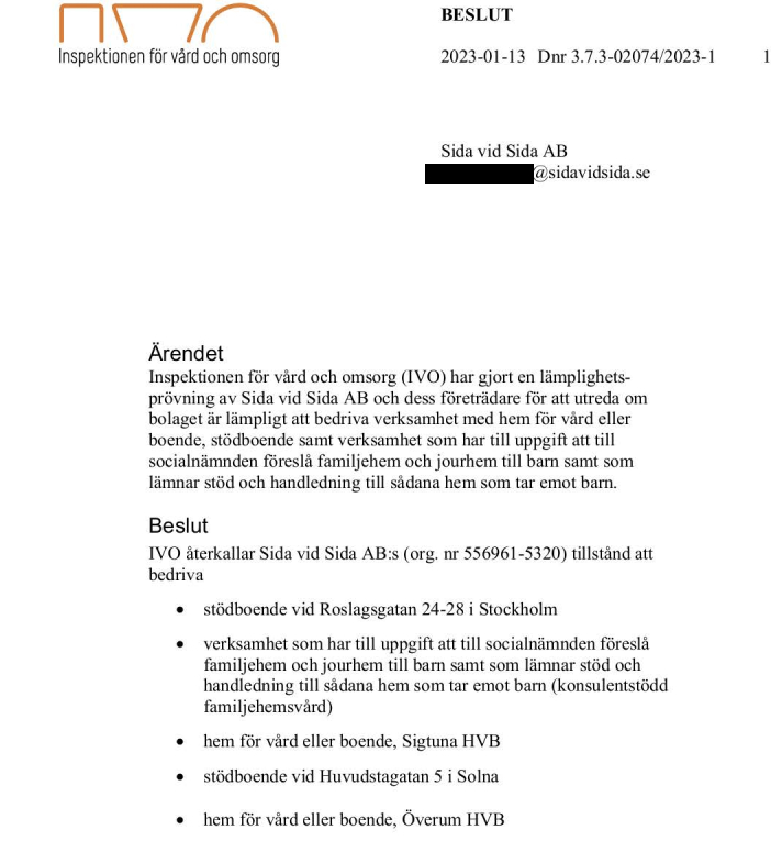 Sida vid sidas tillstånd drogs tillbaka av Ivo i januari 2023. Den statliga myndigheten menade då att Sida vid sida skrivit in ungdomar med kopplingar till organiserad kriminalitet på sina boenden – trots att de inte haft tillstånd från Ivo att vare sig behandla eller rehabilitera ungdomar med dessa problem.