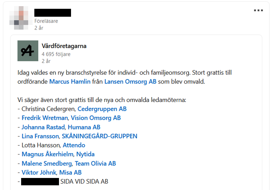 Proletären kan också avslöja att samtidigt som missförhållandena på Sida vid sidas HVB-hem uppdagades satt företagets kvalitetsansvarig i styrelsen för Vårdföretagarna inom branschen Individ och familj. Andra i Sida vid Sidas styrelse driver LSS-boenden i Stockholmsområdet.