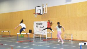 Ett tjugotal ungar i olika åldrar väntar på sin tur att springa häck – tränaren Jonatan Fahlén hörs i högtalarsystemet.