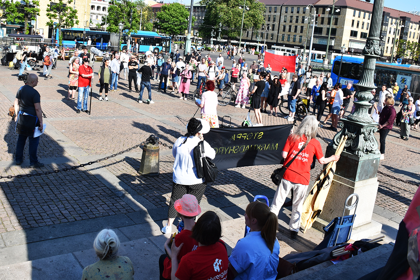 Lördag den 5 juni. Omkring 150 göteborgare sluter upp på Gustav Adolfs torg i protest mot regeringens förslag på införande av marknadshyror, som presenterades dagen innan. Det är en av flera protester i landet.