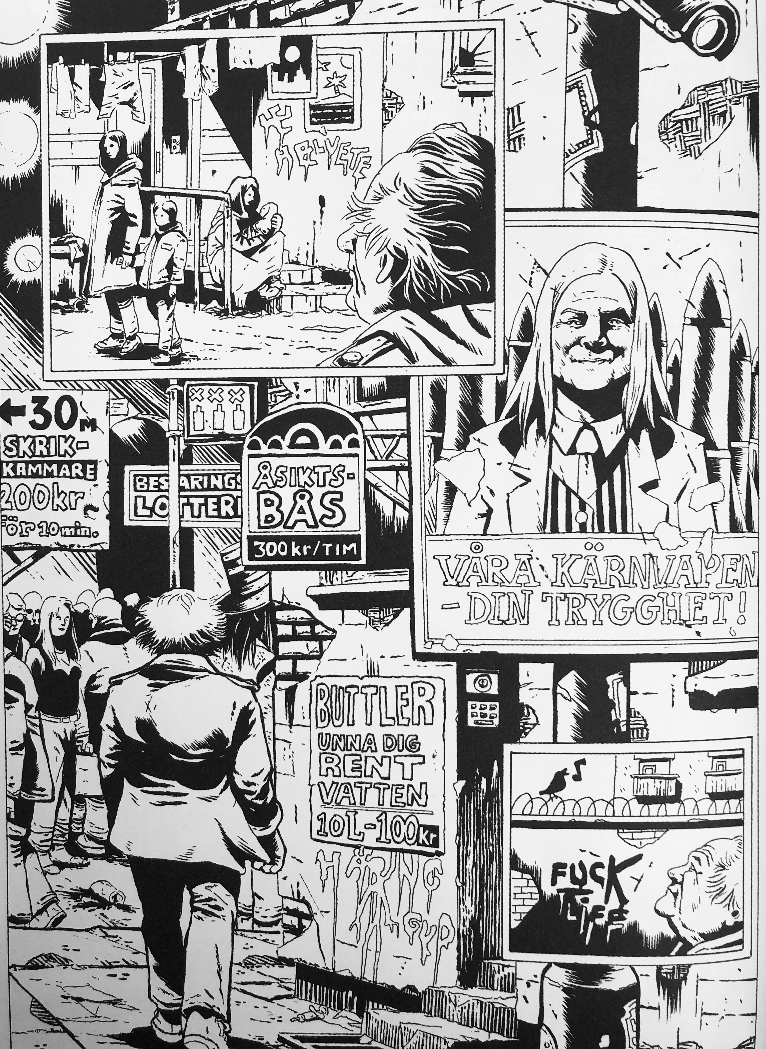 Den förslummade arbetsmarknaden, gängkriminaliteten (fueled by festknarkande mellanchefer), den krackelerade välfärden… här plockar författarna många bra poänger. Och ”Åke J.” som sadistisk polischef i det nya, privatägda Gestapo är klockrent.