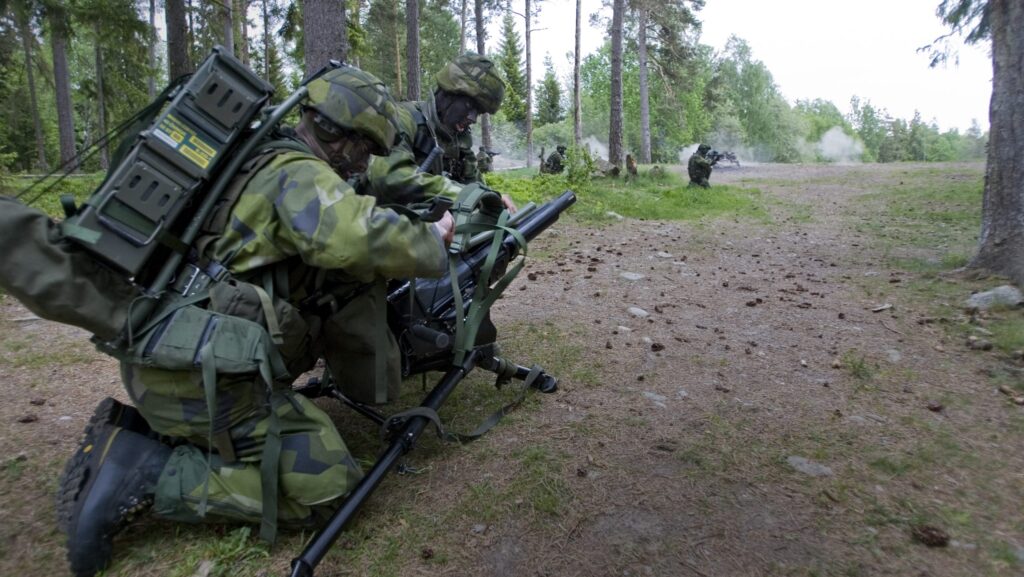 KARLSBORG 20090602.En luftburen skyttegrupp rycker fram mot anfallsmålet. Som understödsvapen har gruppen den 80 kg tunga granatsprutan som bemannas av två soldater..Den luftburna skvadron som de tillhör skall genomföra ett anfall under markstridsdagarna..Årets upplaga av markstridsdagarna syftar till att utveckla den markoperativa förmågan inom markstridskrafterna. Temat är implementering av insatsorganisationen 2009 och NBG, Nordic Battle […] Fotograf: Marcus Nilsson/Försvarsmakten