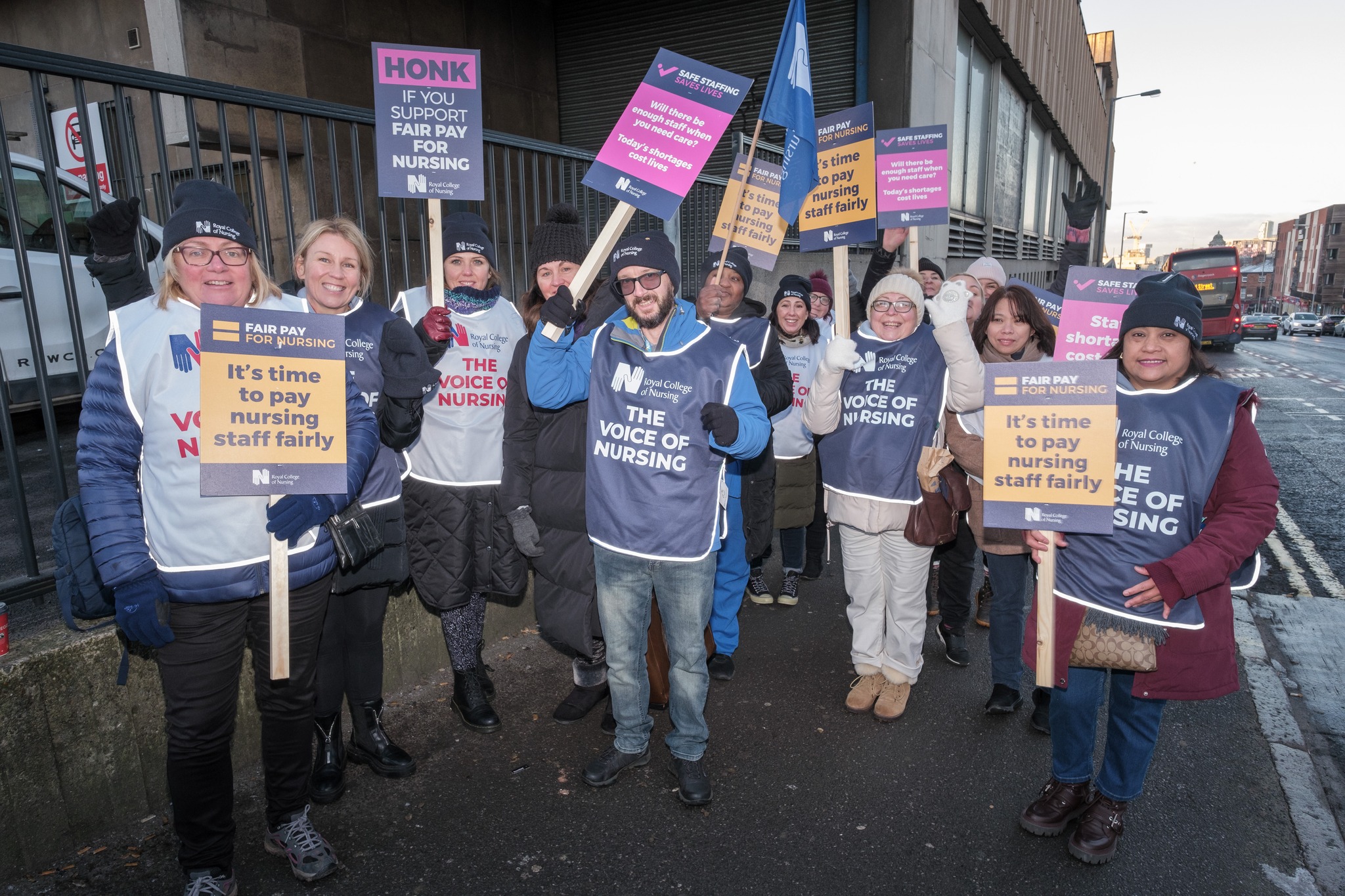 Den brittiska vänstertidningen Morning Star berättar om hur strejkande sjuksköterskor utanför Aintree University Hospital i Liverpool stod med plakat med budskap som ”Ni klappade för oss under covid, agera för oss nu”, och ”Om sjuksköterskorna är här ute är det något som är fel därinne”.
