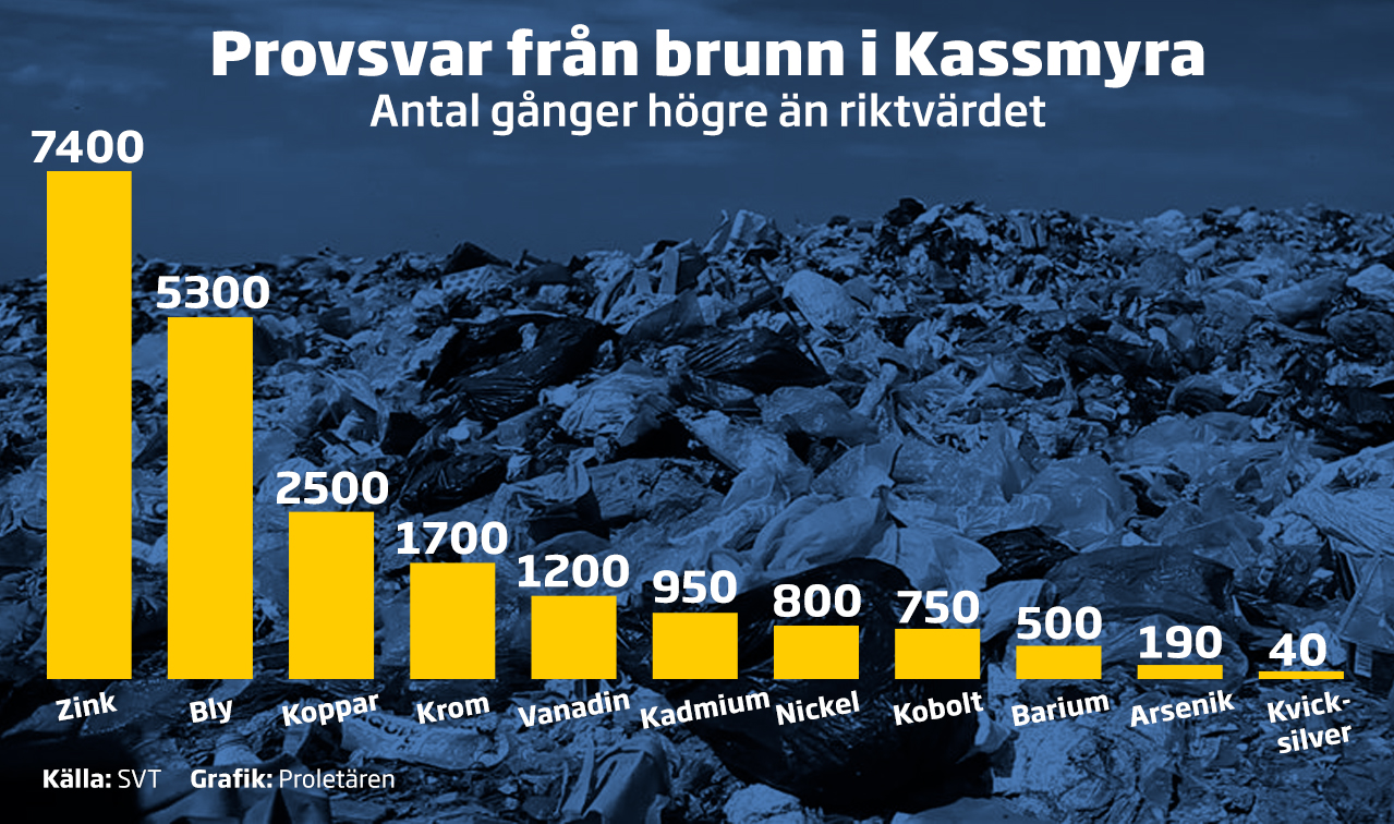En soptipp i Kassmyra, i Botkyrka söder om Stockholm, släpper ifrån sig höga värden av tungmetaller och dioxiner. Utsläppen är giftiga för människor och hotar nu dricksvattnet i området. Utsläppen av zink är till exempel 7.400 gånger högre än normalhalten i svenska vattendrag och sjöar. Blyhalten är 5.300 gånger högre och halten av arsenik 190 gånger högre än normalt.