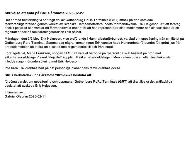 – Det behöver göras så mycket som möjligt för att belysa detta och stoppa uppsägningen av honom. Bland arbetskamraterna på SKF tycker de flesta att det är förfärligt och att vi måste göra det vi kan. Det är en attack mot hela fackföreningsrörelsen.