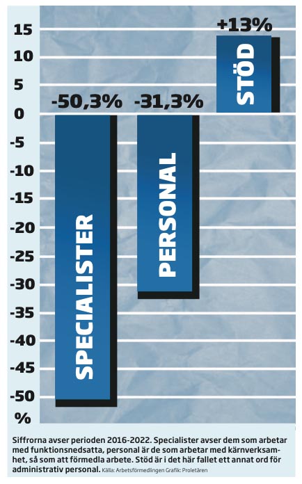 Nu kan Proletären avslöja att det rakt motsatta har skett. Sedan 2016 har mer än hälften av all personal som jobbar mot funktionsnedsatta försvunnit från Arbetsförmedlingen. Nedan följer några exempel: