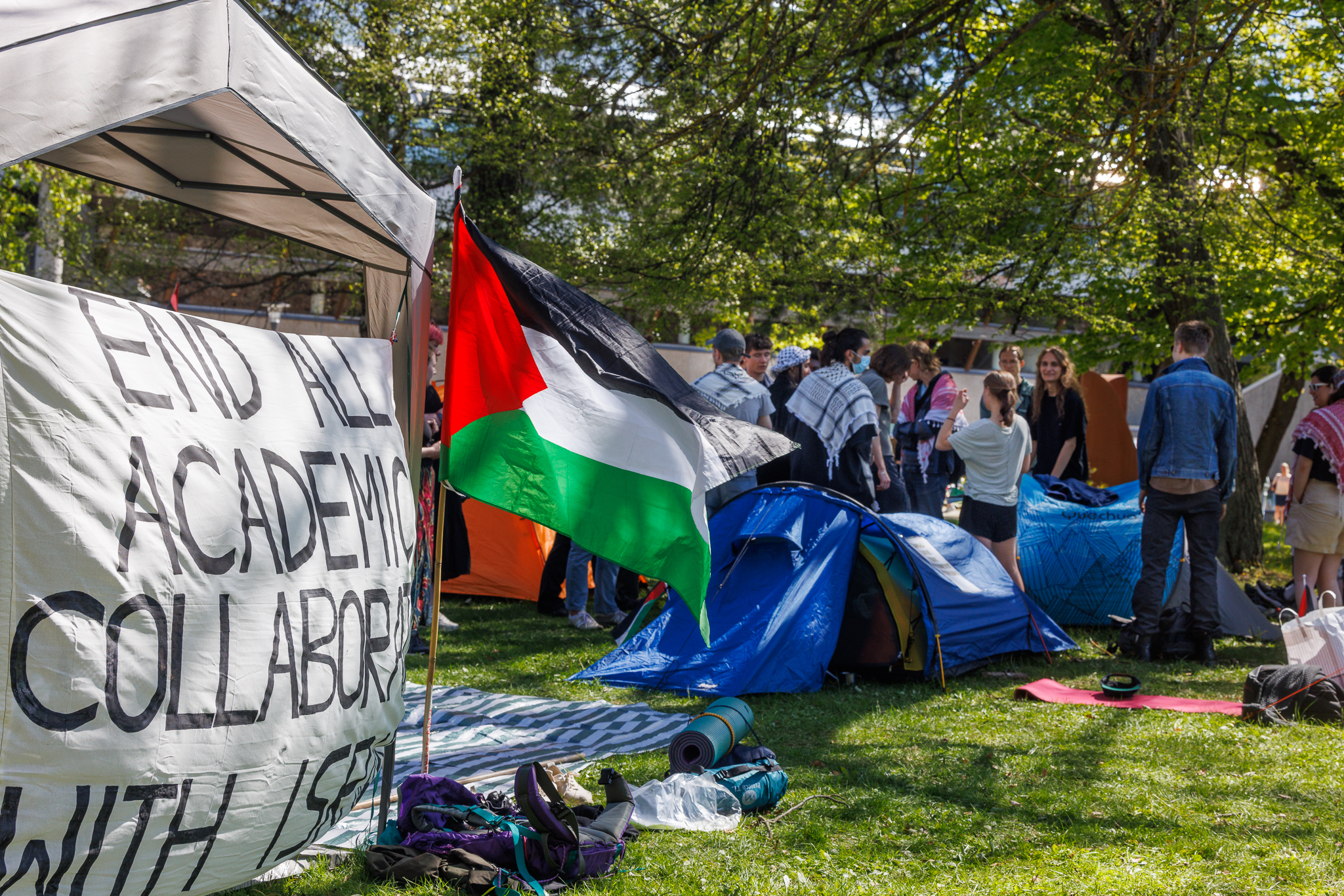 Ett 20-tal tält slogs upp under tisdagsmorgonen framför rektorsbyggnaden vid Stockholms universitet. Banderoller med budskap om att stoppa Israels folkmord sattes upp. Serveringsbord med frukt, kaffe och fika gjordes i ordning. Dunkar med färskvatten fylldes på och gick åt i sommarvädret.
