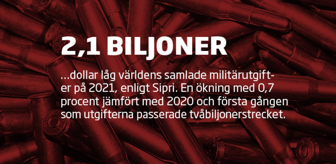 Ändå är det fortfarande bara en bråkdel av de otroliga summor som läggs på vapen och krigsförberedelser om man ser till hela världen. Enligt fredsinstitutet Sipris senaste genomgång av världens militärutgifter spenderades förra året 2.113 miljarder dollar på militären. Fyra gånger hela Sveriges BNP.