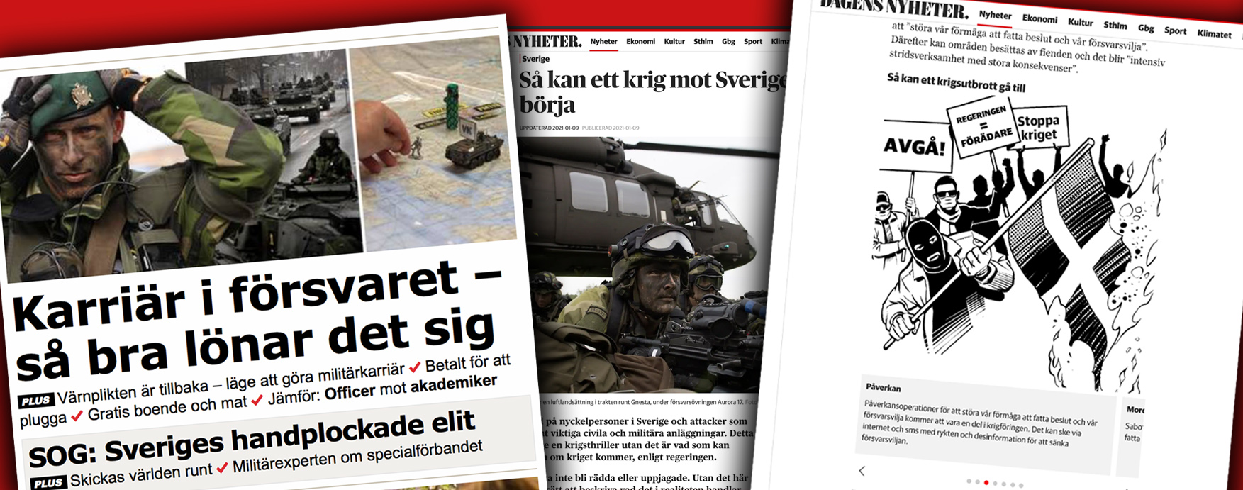 De senaste åren har vi sett fler och fler artiklar och nyhetsinslag som normaliserar krig och militarism. Artiklar i bland annat Aftonbladet och DN med rubriker som ”Karriär i försvaret – så bra lönar det sig” och ”Så kan ett krig mot Sverige börja” (komplett med misstänkliggörande av dem som skulle vara mot kriget), och därutöver en uppsjö av artiklar av typen ”Så bra är våra stridsvagnar”, och så vidare.