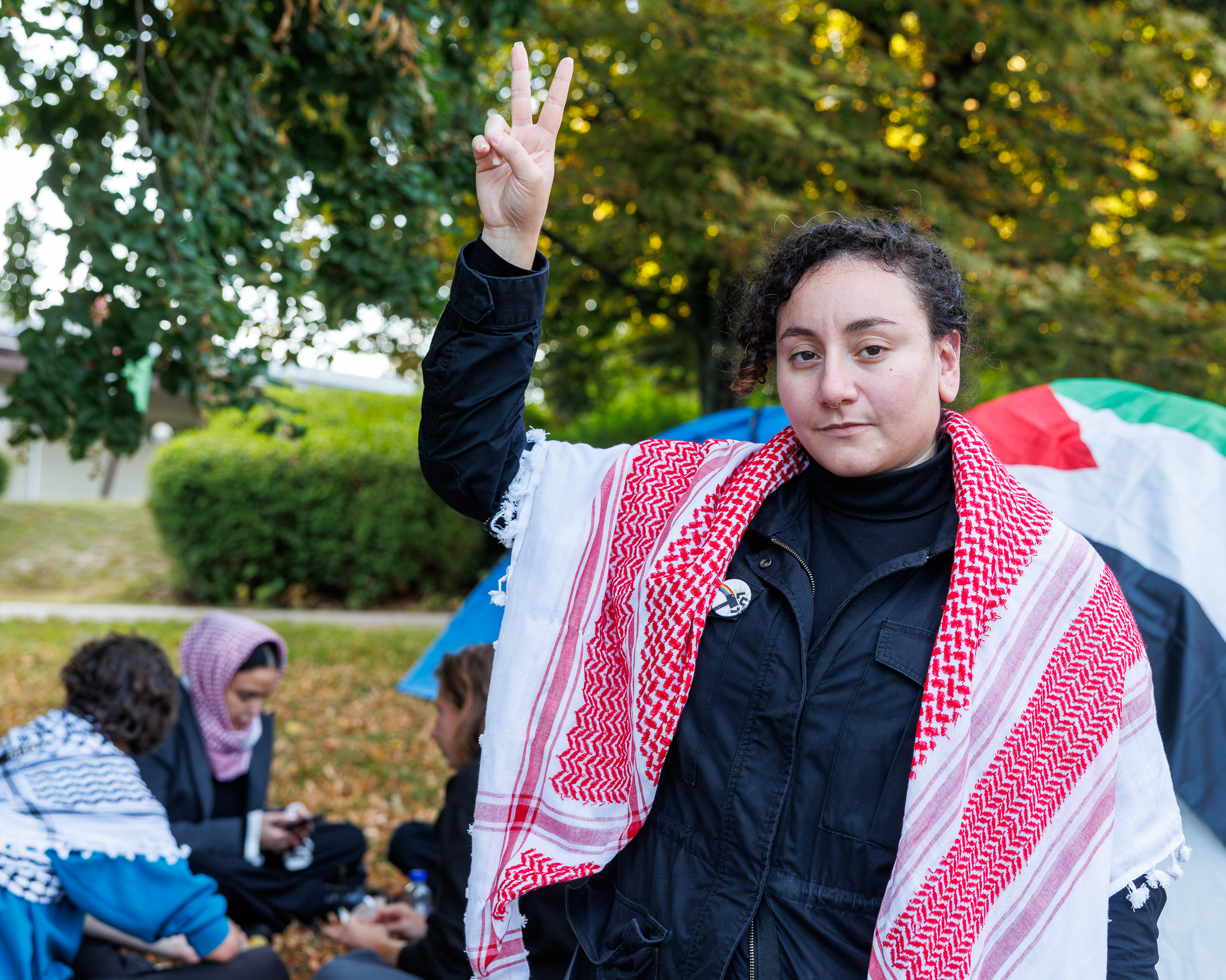 – Vi har öppnat ett nytt tältläger för att vår närvaro skall vara synlig hela tiden. Vi vill också visa alla nya studenter att det finns en solidaritetsrörelse för Palestina här. Men klockan fyra i dag fick vi beskedet att lägret skulle rivas, för att det råder campingförbud på området. När vi frågade vad det var för skillnad på tältlägret vi hade före sommaren så svarade de att det är en ny situation. De hade tittat på lagen.