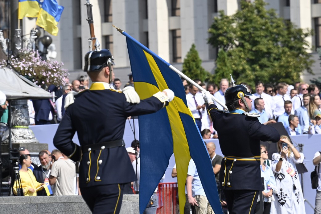 ”Stolta över att få delta i firandet”, skriver svenska ambassaden i Ukraina på Twitter och delar ett klipp på svenska soldater i paraduniform.