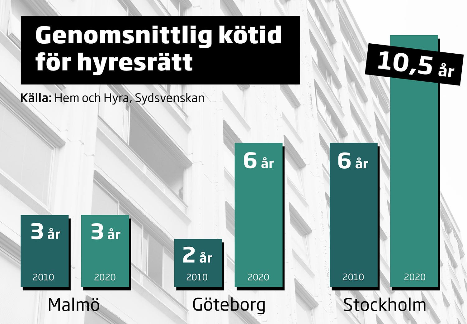 I Stockholm står 670.000 personer i kö. Den genomsnittliga kötiden för en hyresrätt är 10,5 år. 2010 var kötiden sex år.